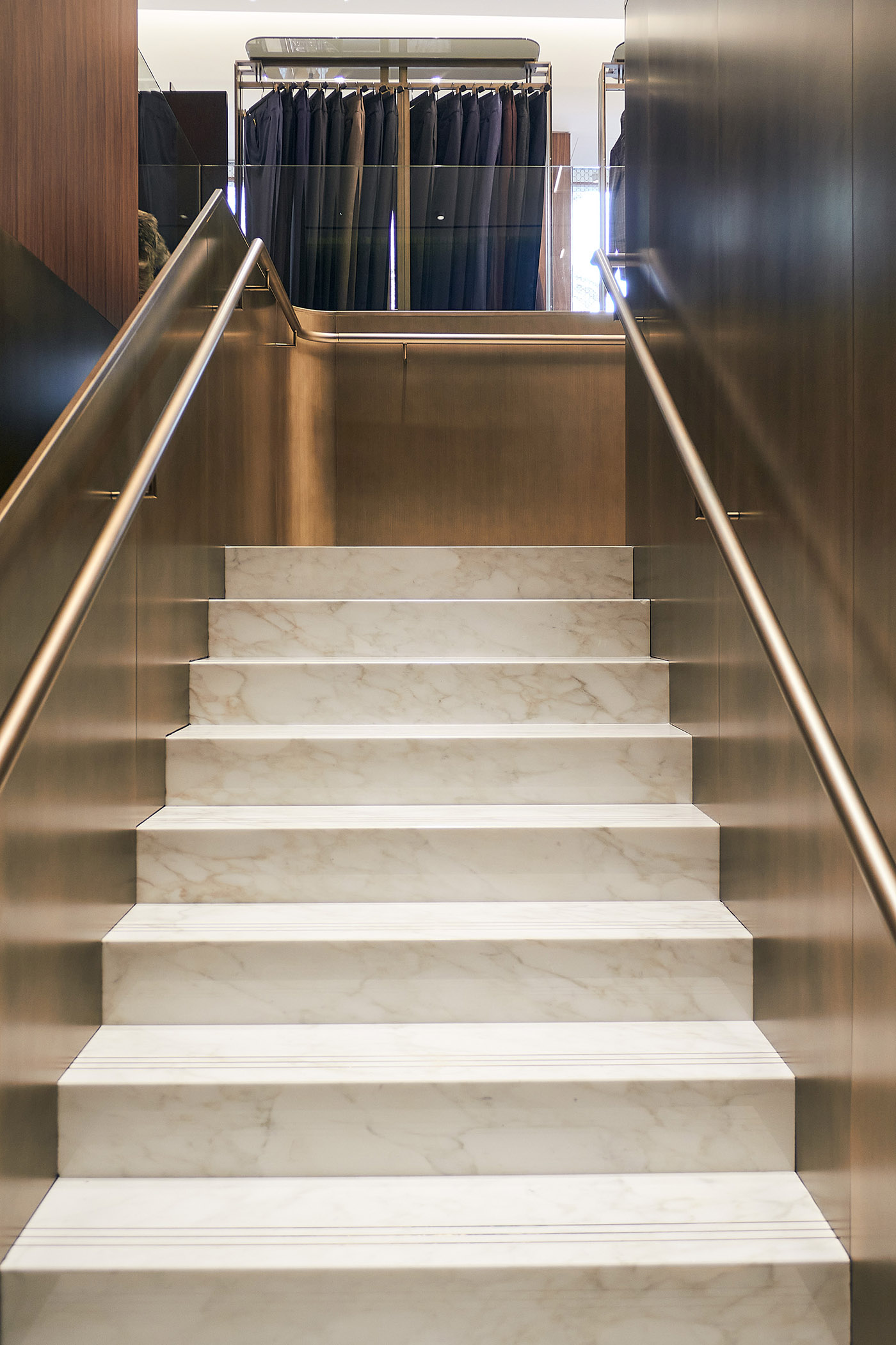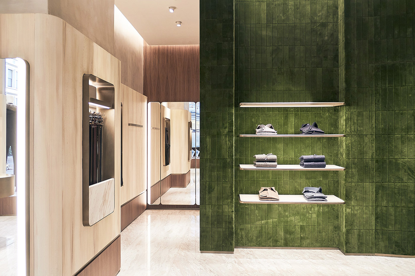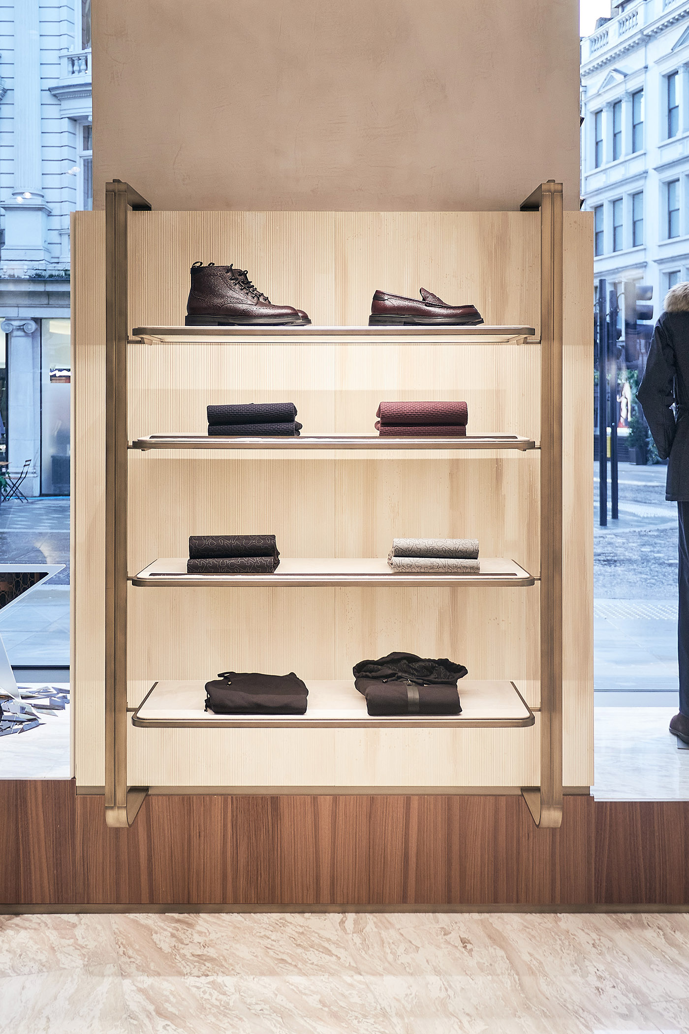 Le superfici in marmo venato, con le loro tonalità chiare, contrastano con le fasce orizzontali in noce Canaletto, rimando al patrimonio architettonico della New Bond Street. Il piano superiore ospita una VIP Room, dove è possibile prendere un appuntamento “Su Misura”: il servizio made to measure, attivo tutto l’anno all’interno della boutique, diventa così ancora più esclusivo, per rispondere agli alti standard di produzione del brand