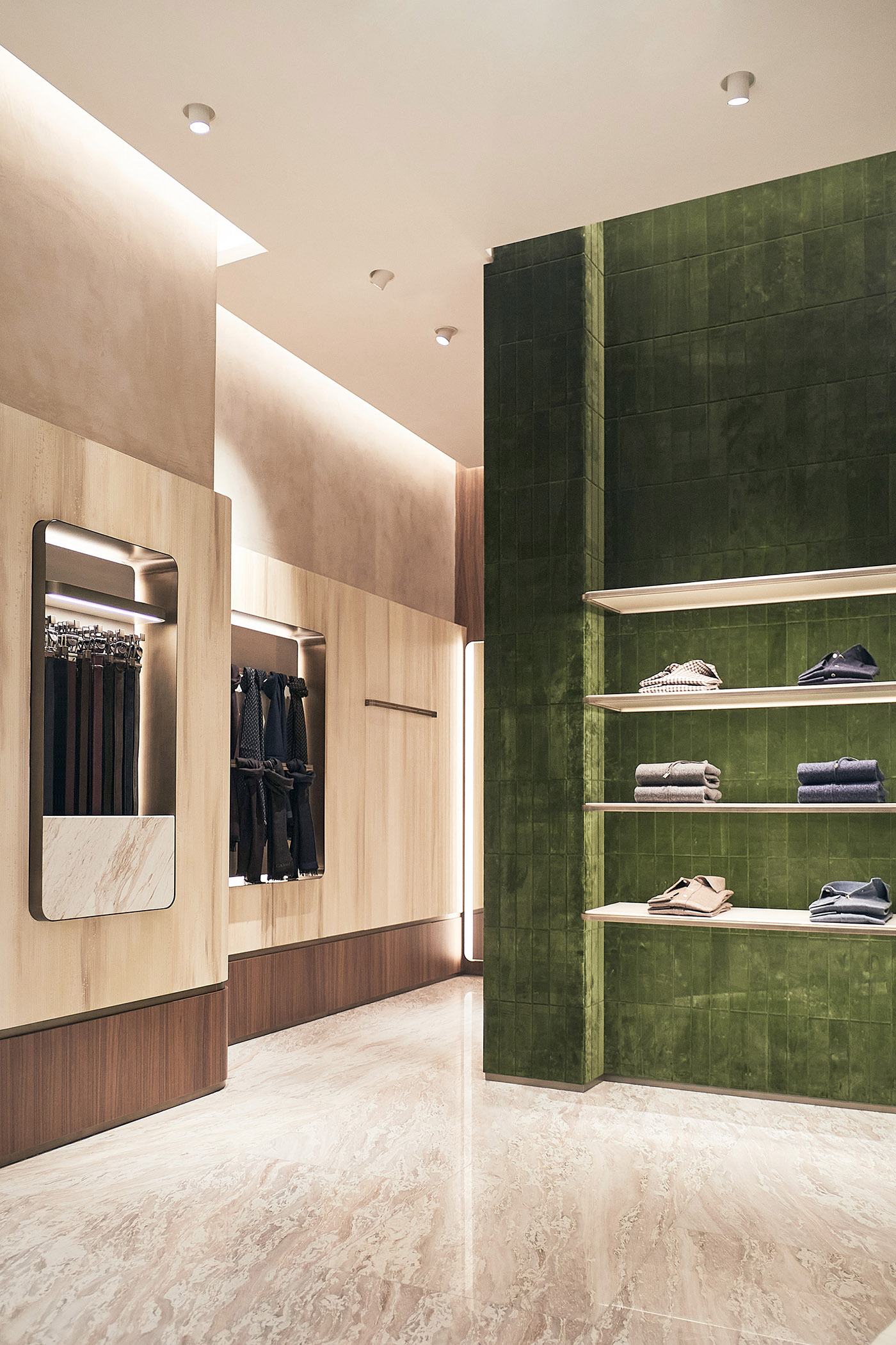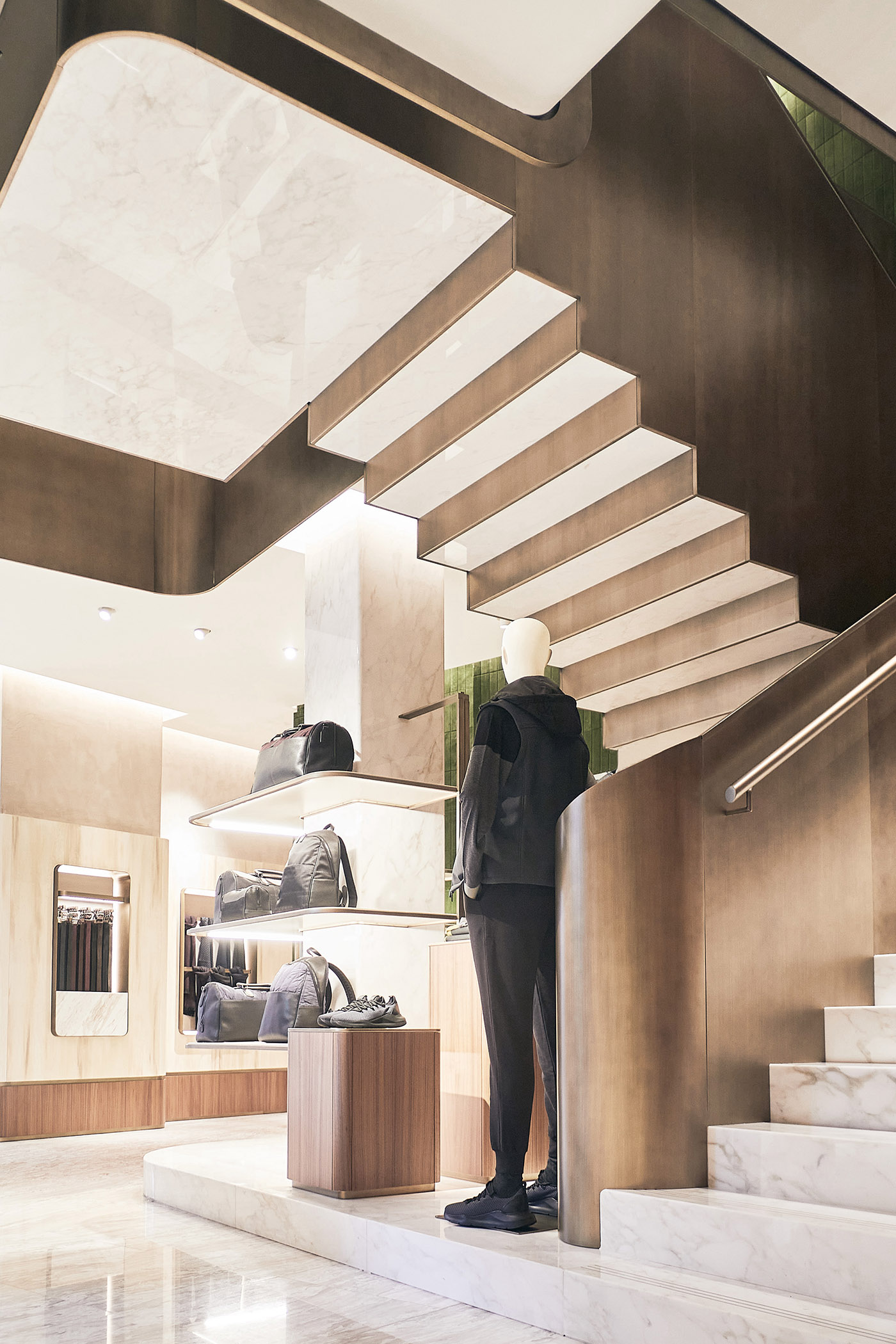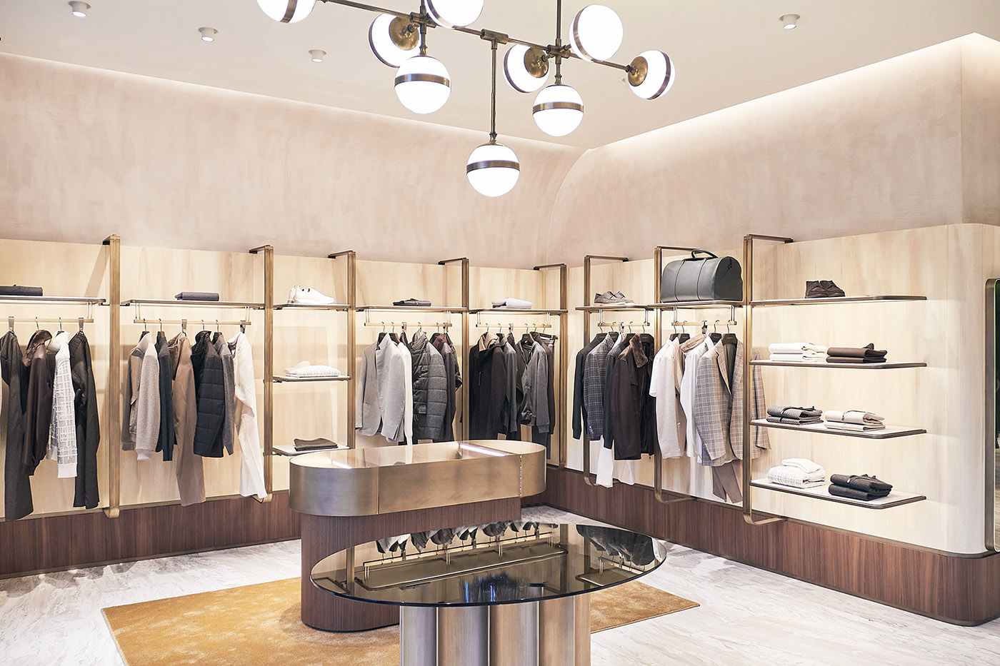 Le superfici in marmo venato, con le loro tonalità chiare, contrastano con le fasce orizzontali in noce Canaletto, rimando al patrimonio architettonico della New Bond Street. Il piano superiore ospita una VIP Room, dove è possibile prendere un appuntamento “Su Misura”: il servizio made to measure, attivo tutto l’anno all’interno della boutique, diventa così ancora più esclusivo, per rispondere agli alti standard di produzione del brand