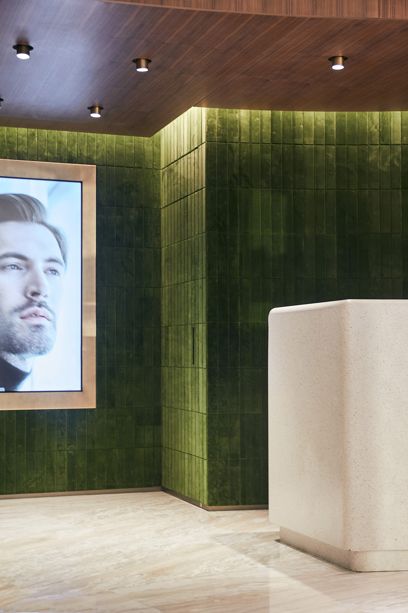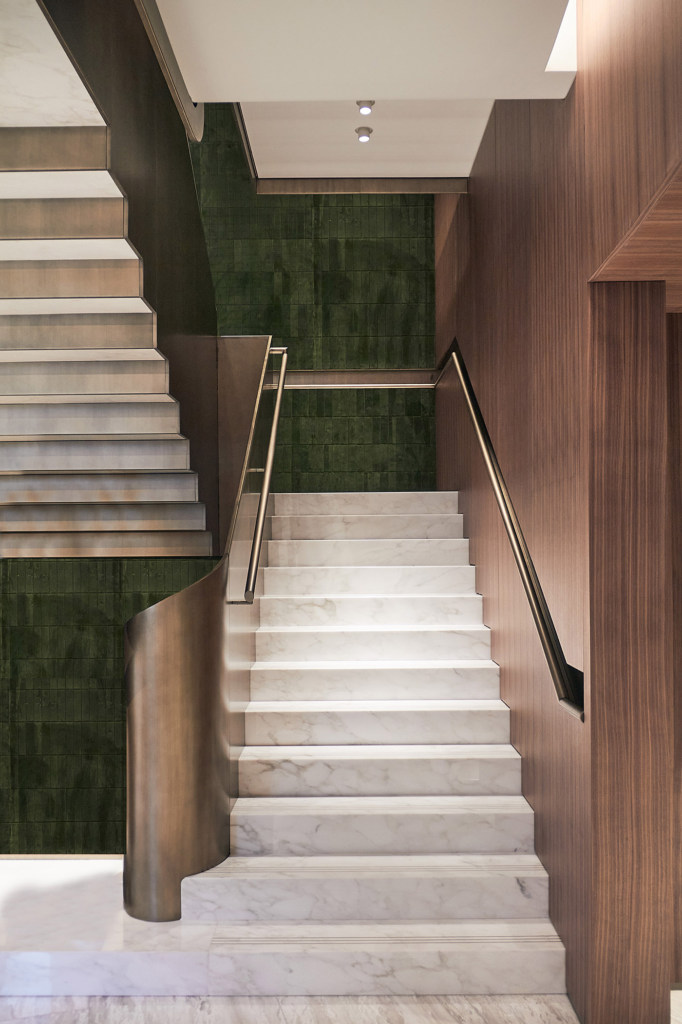 Lo spazio racchiude all’ingresso la grandiosità del quartiere di Mayfair, dove è collocato: la hall è sovrastata dalla lampada Peggy a nove luci di Vistosi, originariamente disegnata da Hangar Design Group per la Collezione Peggy Guggenheim sul Canal Grande a Venezia, e arricchita dal rivestimento a mosaico in tessere di velluto verde