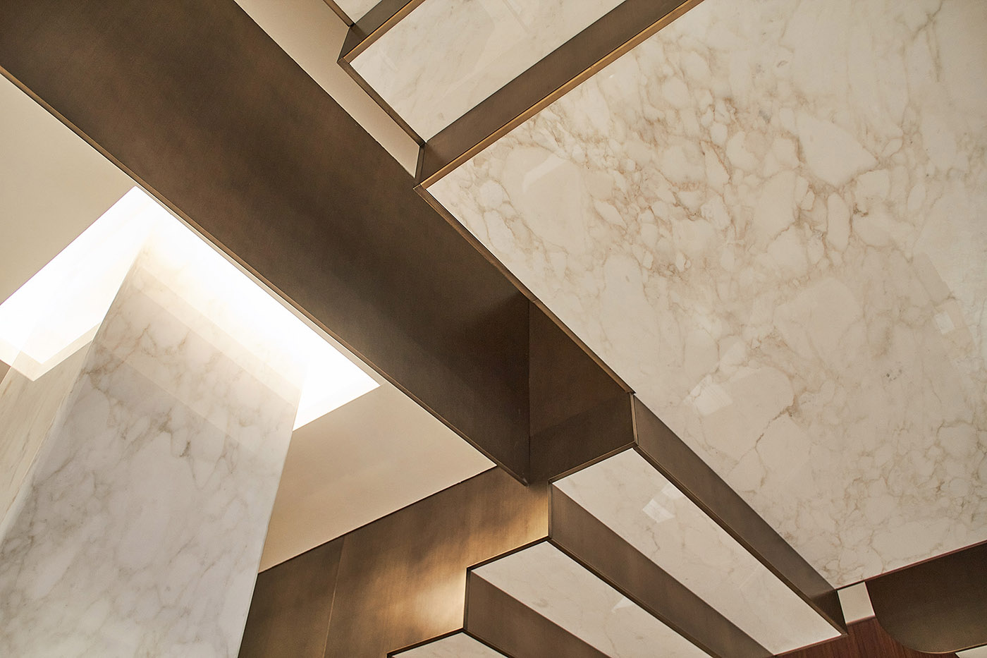 Tratteggiati con eleganza, gli spazi della boutique, distribuiti su 310 mq, sono un’ode alle grandi architetture residenziali milanesi realizzate nella prima metà del XX secolo. I richiami meneghini si ritrovano nelle linee arrotondate, nei profili sinuosi, nei marmi lucenti e nelle texture morbide del negozio, che appare come uno scrigno in cui due città, Milano e Londra, si incontrano