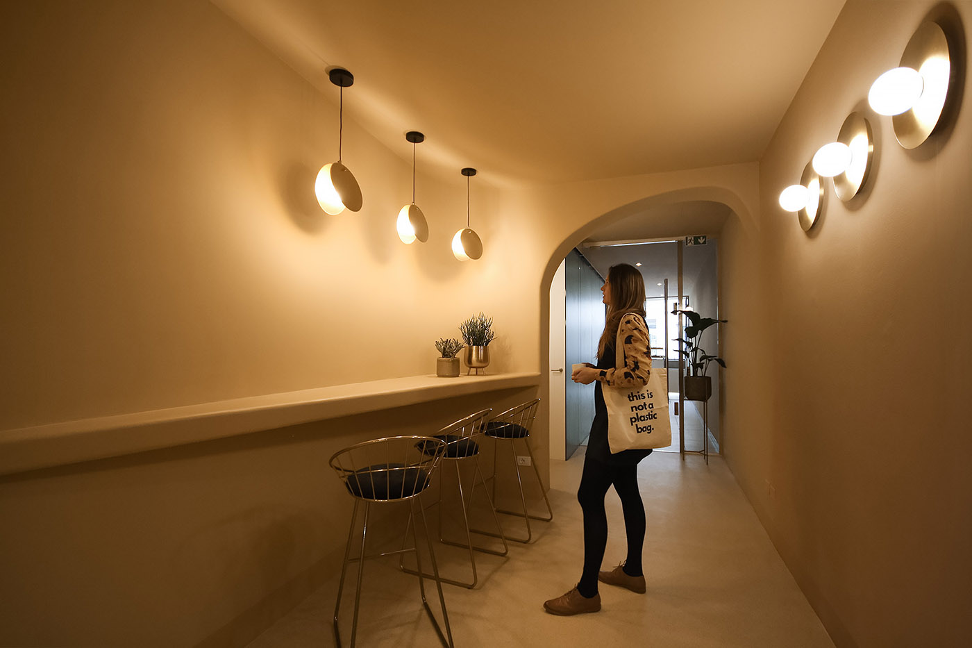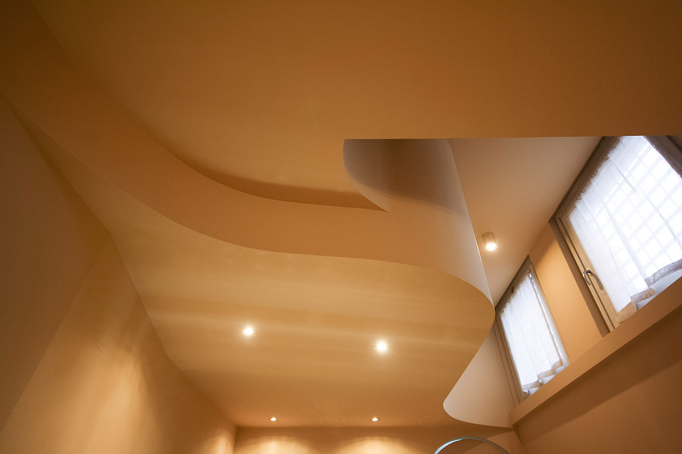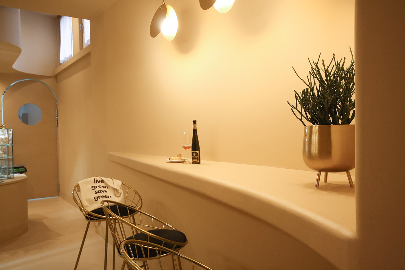 A enfatizzare questo gioco di linee morbide e curve asimmetriche si somma il gioco delle sospensioni luminose in ottone dalla forma circolare la cui luce si diffonde in maniera indiretta e mai netta. La scelta degli arredi rispecchia lo stesso stile anche nella scelta dei materiali, metallici e bronzati, mai in contrasto ma che anzi si fondono con lo sfondo e lo riflettono regalandogli punti di luce
