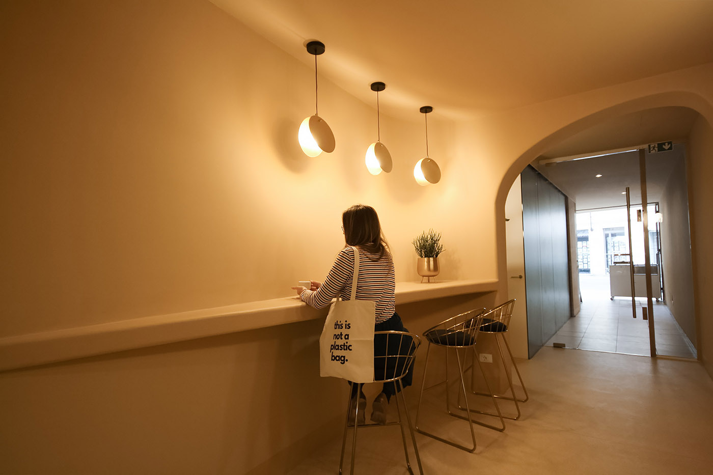 Da quel punto in poi definire la connotazione del locale come espressione del brand è diventato di fondamentale importanza. Lo Studio, ispiratosi alle architetture organiche del Goetheanum a Dornach di Rudolf Steiner, ha voluto introdurre le forme sinuose e morbide, quasi ad eliminare ogni angolo e sostituirlo con forme curve. La sensazione è di entrare dentro un posto ovattato, che vuole lasciare fuori i rumori e lo stress del mondo per potersi cosi godere un “dolce” riposo. Oltre alle forme organiche, lo spazio regala una sensazione di accoglienza grazie anche all’uso di un unico colore che si distribuisce su tutte le superfici, creando giochi di ombre e chiaroscuri: il colore scelto è il beige o anche detto color “crema pasticciera”, quello appunto del cannoncino
