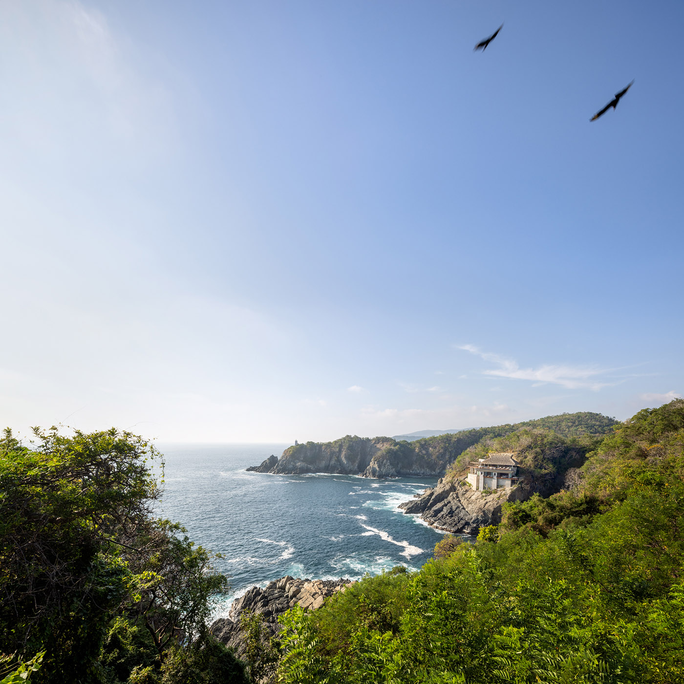Sulla costa pacifica di Guerrero nella baia di Zihuatanejo, arroccata su scogliere costantemente in balia del mare, sorge Casa Acantilado. Aperta e permeata dall’ambiente spettacolare che la circonda, la costruzione concettualizza l’idea di riferimento luminoso nell’immensa oscurità notturna dell’oceano, emergendo dalle rocce e dialogando col piccolo faro poco lontano