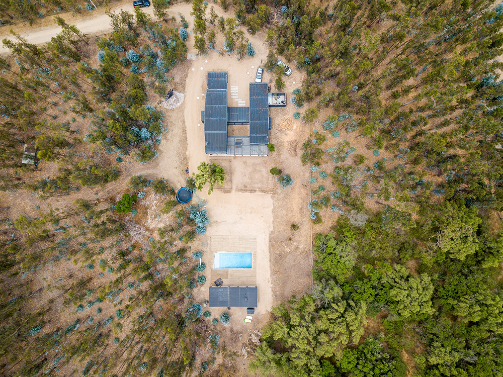 Il progetto, ad opera di Benjamin Goni Arquitectos, in collaborazione con Claro + Westendarp arquitectos, sorge su una collina in pendenza ed è suddiviso in 3 volumi, lasciando uno spazio come patio di accesso e sfruttando al massimo luce e panorama