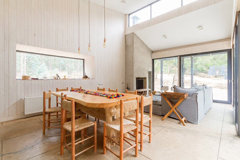 Abitazione in legno a forma di H. Alberi autoctoni mantenuti e incorporati nel progetto