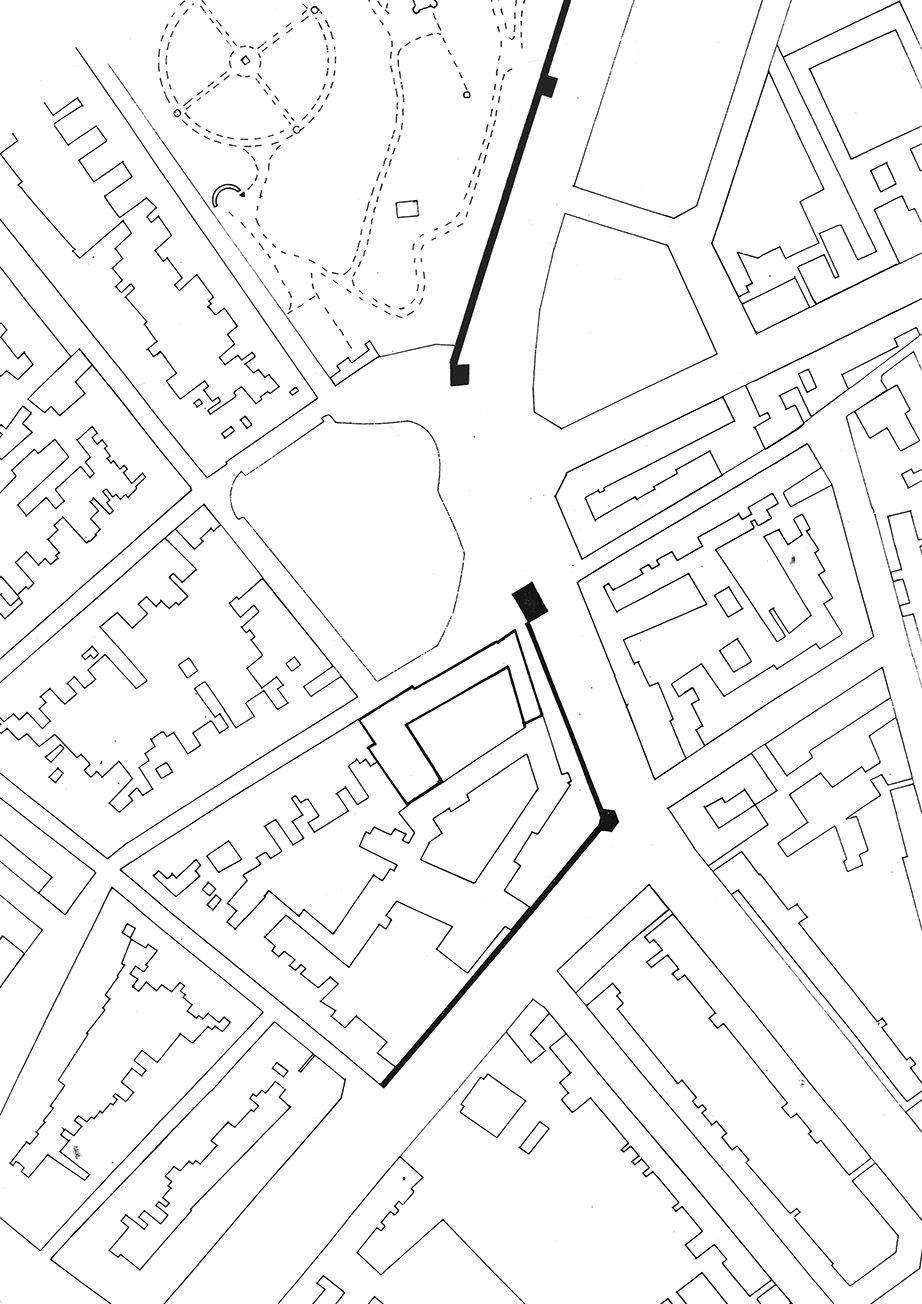 L'addizione al complesso dell'antico convento, poi Scuola delle Leopoldine, nel punto più prossimo alle mura, feconda l'idea di salita e raggiunge la dimensione, in sommità, della veduta. Il paramento basamentale posticcio - che istituisce una falsa unitarietà dell'edificio proprio a partire dalla parte demolita - viene rimosso dal piano di facciata, per restituire leggibilità alle parti preesistenti della fabbrica, anche in rapporto al nuovo intervento di completamento. In tal senso l'inopportuna prosecuzione del medesimo paramento, la cartella in elevazione, che chiude l'antico pomerio sulle mura, viene demolita, anche per riaprire la vista verso le scale e l'albero esistenti all'interno, lungo il pomerio