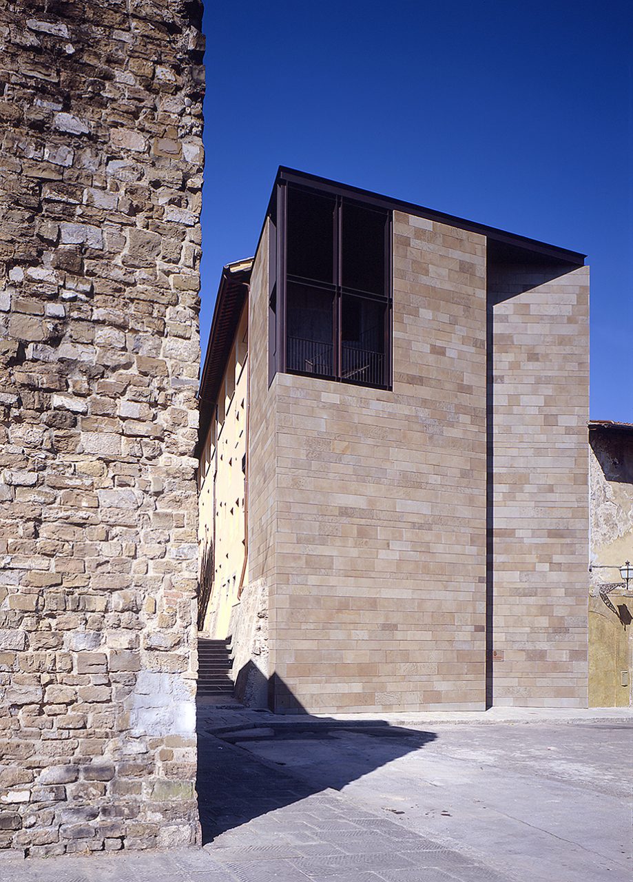 Un corpo parzialmente chiuso all'esterno si assesta sulle tracce delle antiche fortificazioni di Cosimo, in passato parzialmente demolite, e le reinterpreta disponendosi attraverso due setti murari sfalsati, complessivamente rispettando la sagoma stradale esistente. L'ingresso alla salita avviene attraverso il taglio verticale che deriva dallo sfalsamento. A partire dall'impianto planimetrico dell'antico bastione vengono rimessi in evidenza gli imponenti spessori murali e l'orditura da costruzione, come pure, verso il pomerio, la scarpa esterna del muro, liberato dalla cartella posticcia. Si traspone sul piano di facciata lo scarto esistente in planimetria tra la giacitura muraria dei muri di spina della fortificazione - profittando per creare, in quell'interstizio, il vano ascensore - e il muro perimetrale che chiude il corpo di fabbrica lungo la via Camaldoli