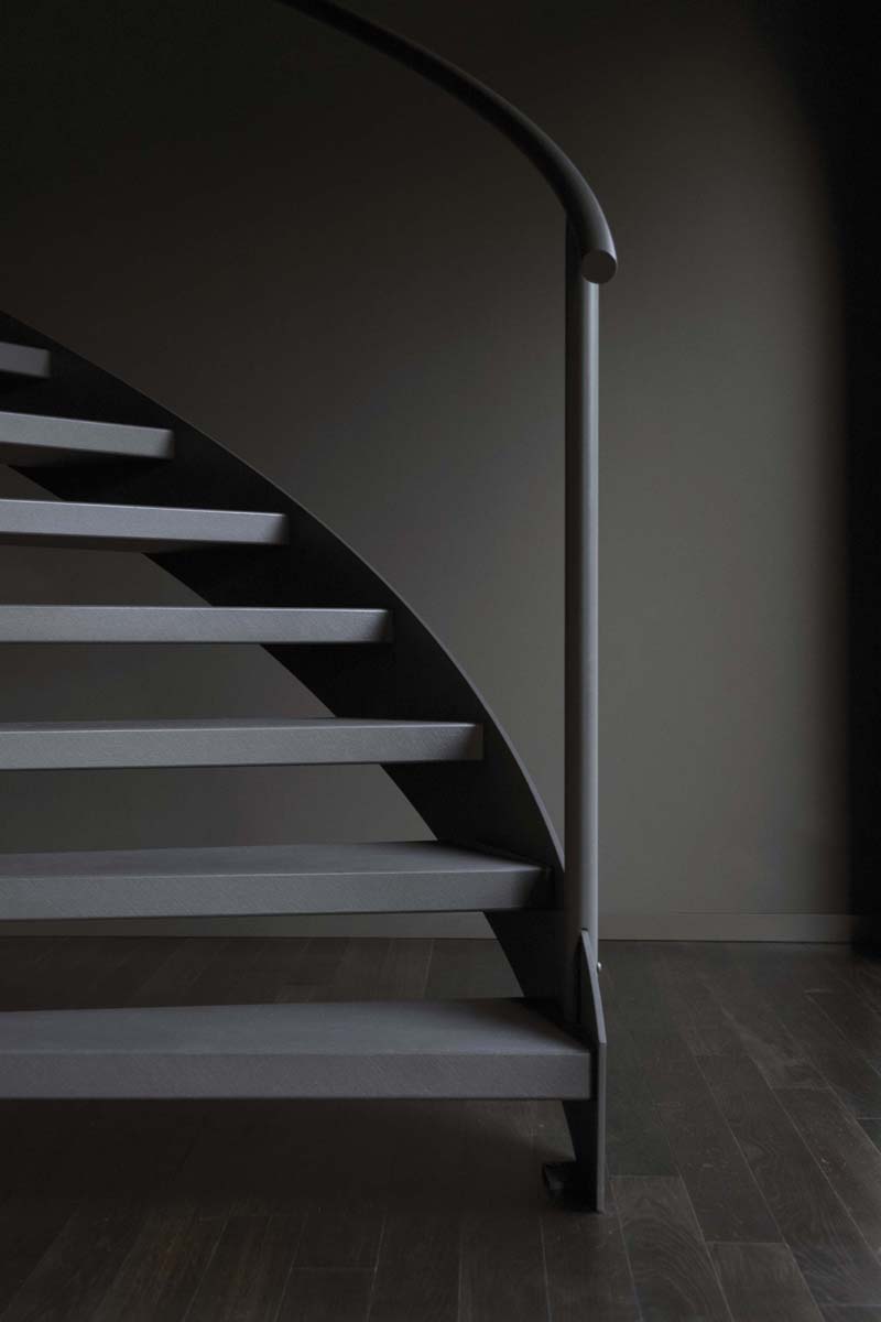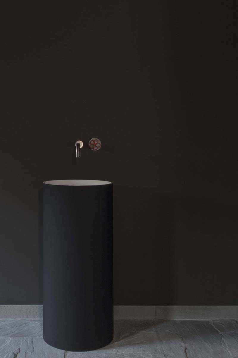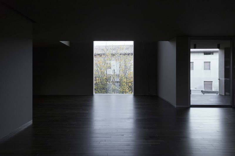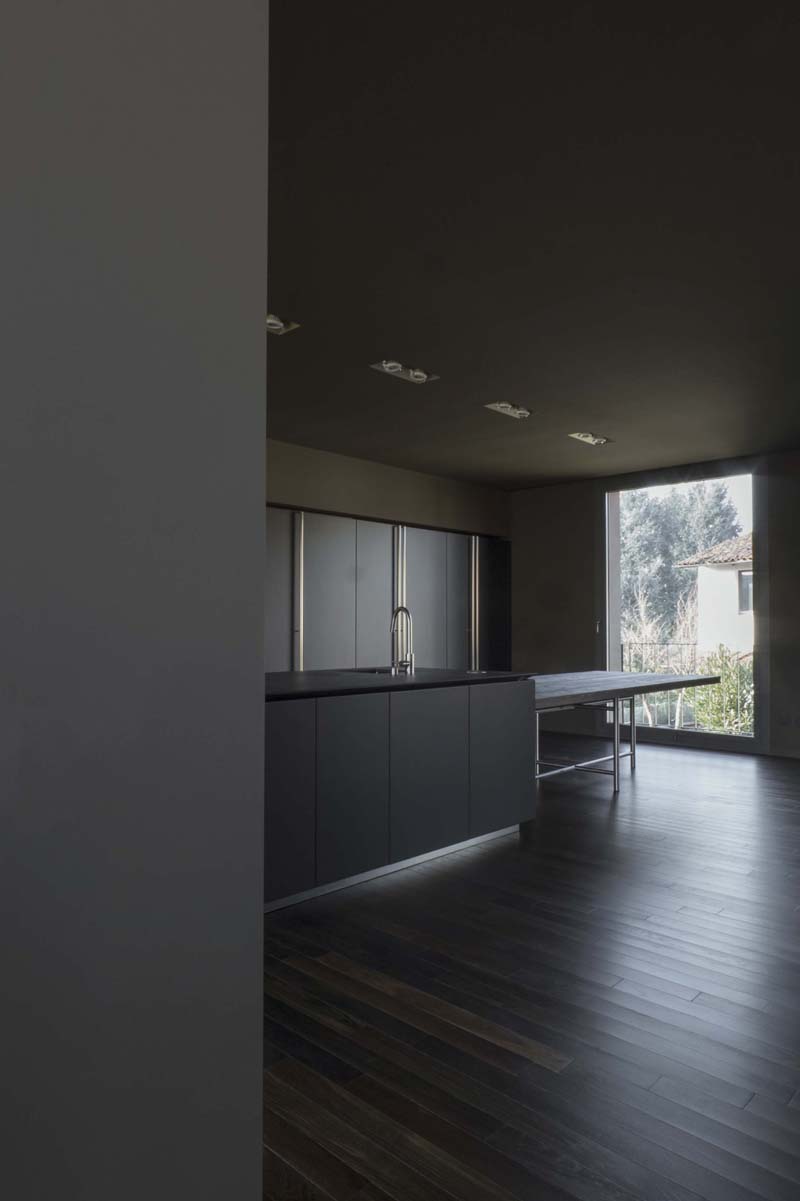 Lo stesso avviene nella zona living al primo piano e la zona notte al secondo, nei quali le ampie superfici in vetro, caratterizzanti l'edificio, contrastano l'oscurità degli interni
