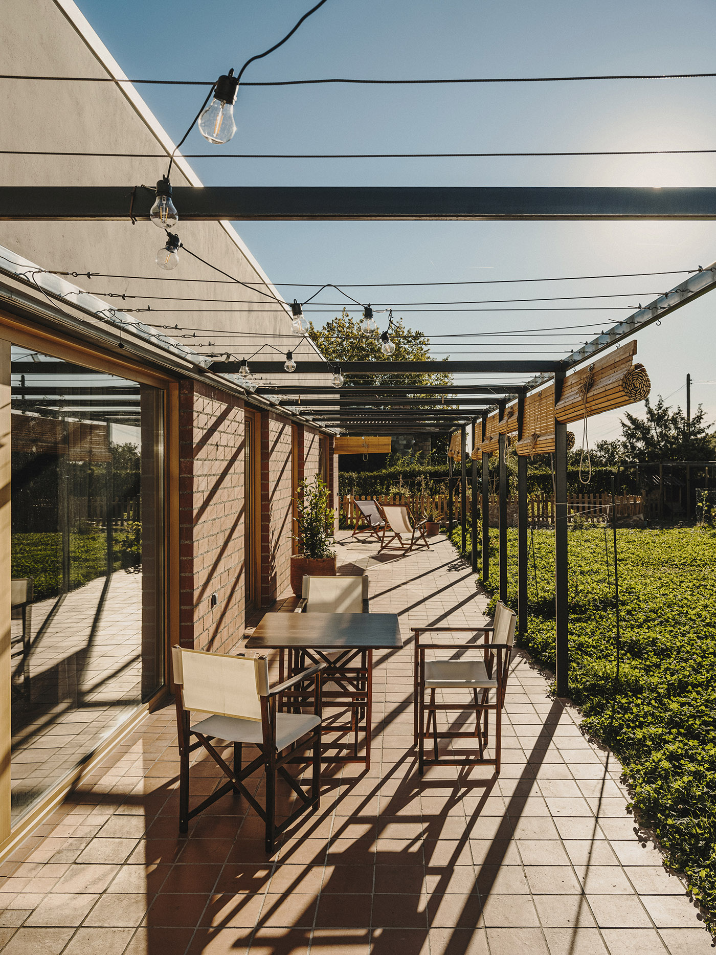 Anche la facciata sud è protetta da un pergolato vegetale che contribuisce ad aumentare la privacy e funge da ottimo regolatore naturale della luce solare. Uno dei punti chiave della strategia bioclimatica, oltre ad un ottimo isolamento dell’involucro edilizio, è il fatto che tutti gli ambienti hanno un affaccio verso sud: una peculiarità che consente un'eccellente prestazione termica passiva di tutti gli spazi abitativi