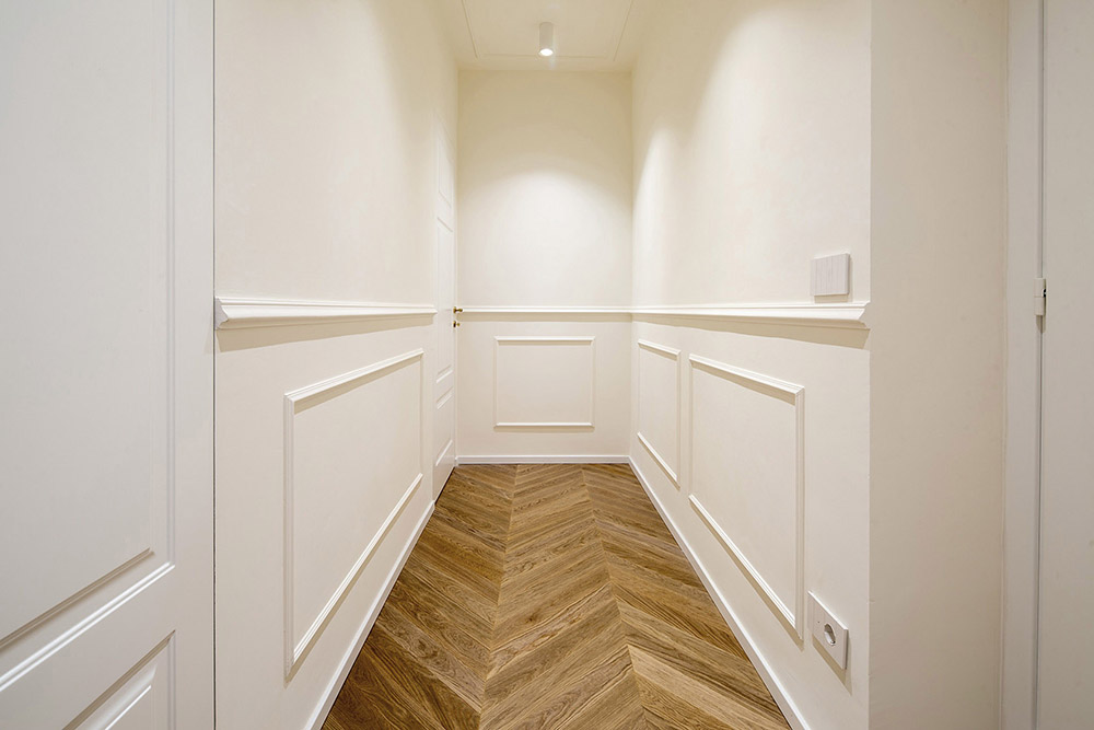 Tra soggiorno e cucina è stato inserito un elemento sospeso di separazione. L'arredo è un mix di classico e moderno. In particolare, l'aspetto elegante è conferito da modanature, archi e stucchi, accentuato dalla presenza di una grande libreria che dall'ingresso ricopre tutta la parete di fronte alle finestre