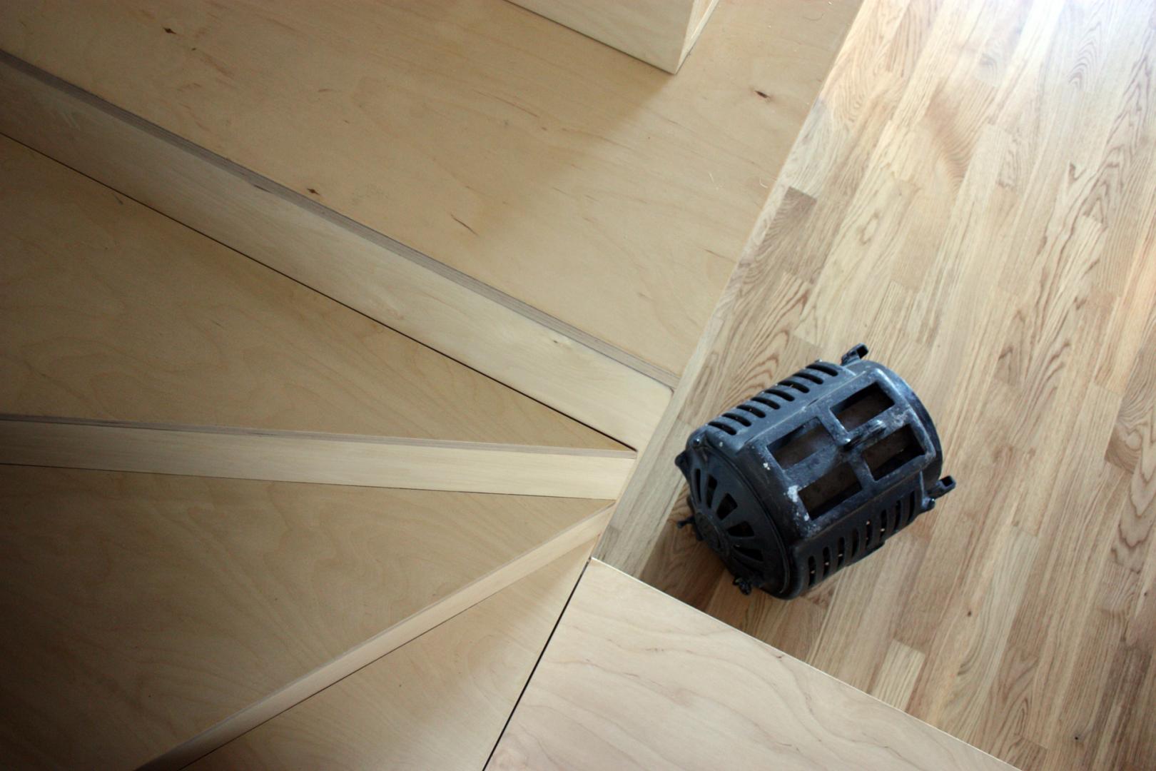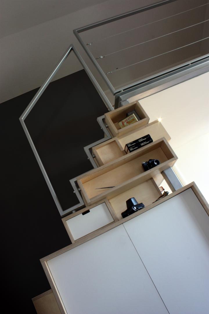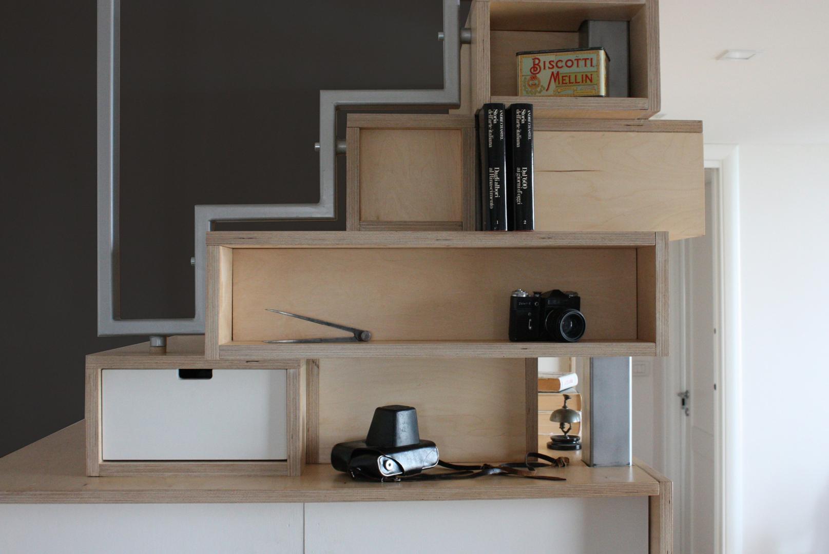 La scala diventa cassapanca, guardaroba, libreria. La struttura del soppalco è realizzata in acciaio con impalcato in legno