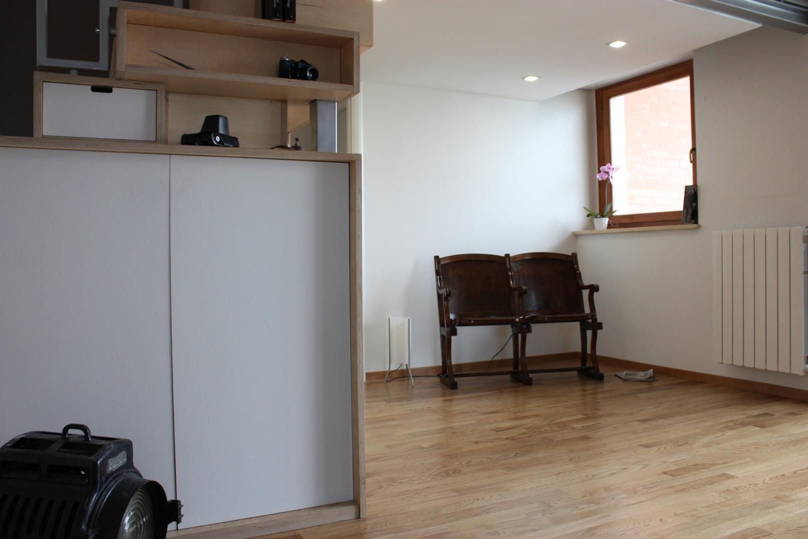 L'obiettivo era quello di ricavare una zona studio, una lavanderia e un piccolo ripostiglio. Soppalcando il soggiorno si ottiene lo studiolo, mentre al di sopra del disimpegno trova spazio il ripostiglio