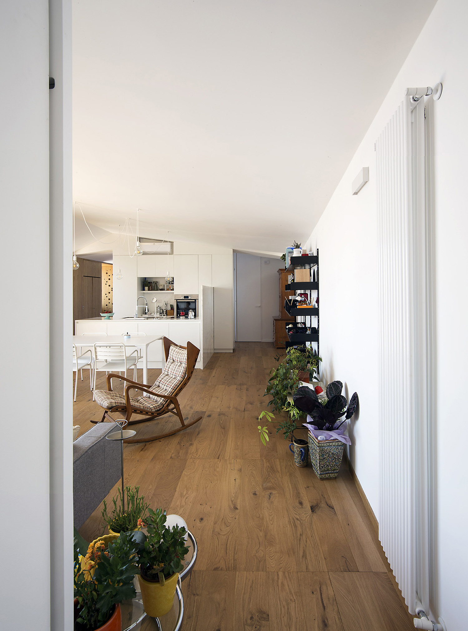 Il progetto trasforma lo spazio agendo sugli elementi che lo compongono: i piani di calpestio e i soffitti, il diaframma murario che separa l’interno dal terrazzo
