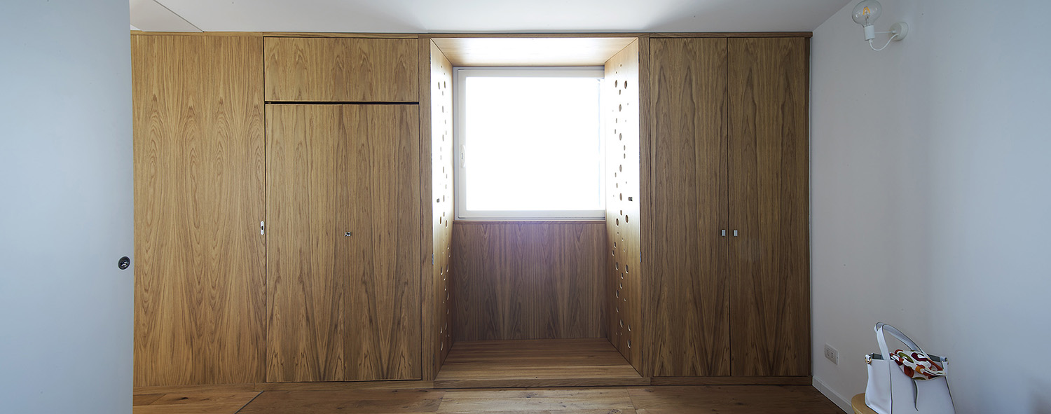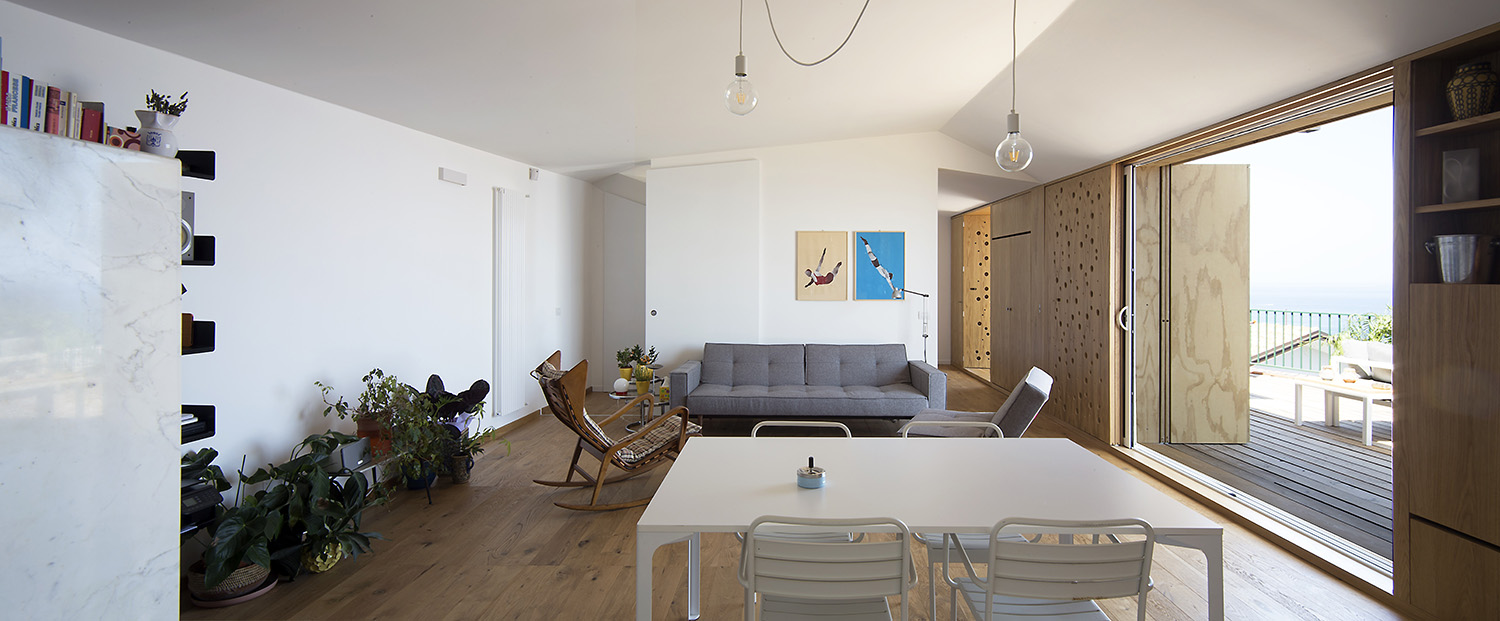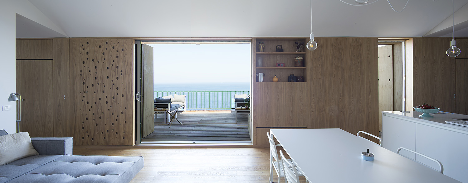 Il fronte verso il mare viene inglobato da un volume in legno che con un sistema di porte, oscuranti e contenitori incornicia l’orizzonte offrendo diversi scorci e variazioni di luce