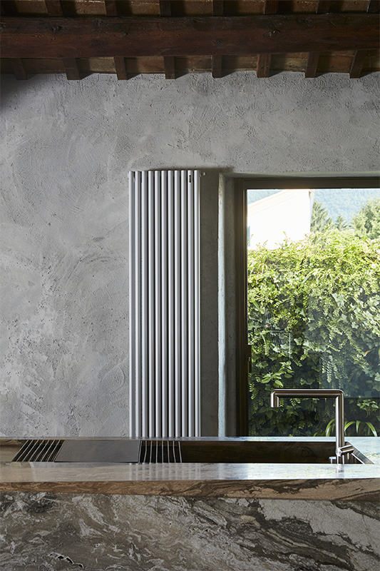 Gli undici caloriferi tubolari installati, che caratterizzano gli ambienti con una presenza calibrata e armonia formale, sono il modello Basic di Tubes, customizzati per questo progetto. La grande pulizia estetica è stata ottenuta grazie all’assenza di valvole, generalmente presenti in questa linea di radiatori. La modifica è stata resa possibile da una particolare saldatura studiata dal reparto ricerca e sviluppo di Tubes, in modo da spostare gli attacchi posteriormente