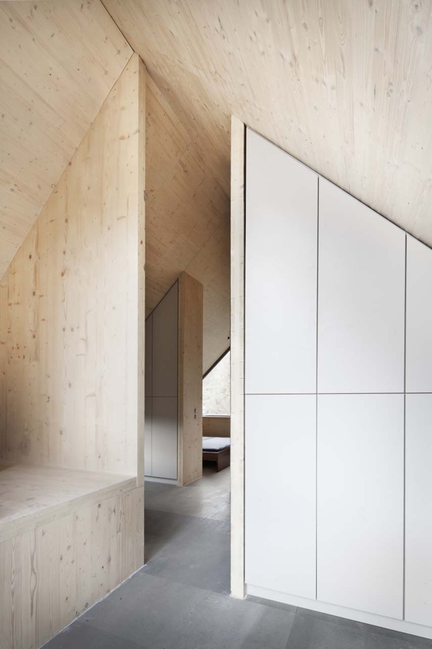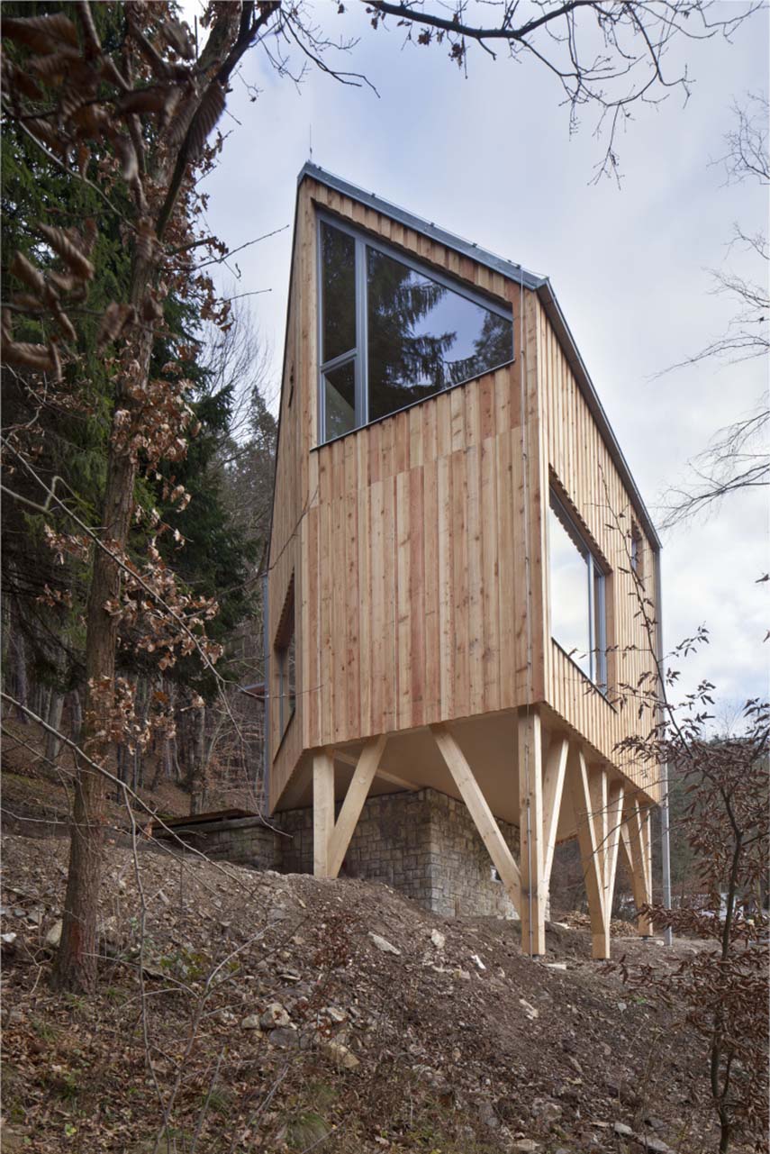 L'unico elemento originale che è stato conservato è un garage, ora trasformato in un pratico locale tecnico. Questo vecchio garage ha visto sorgere sopra di sé una nuova casa, sostenuta da travi di legno e pilastri su solide fondazioni in cemento, una soluzione creativa per ovviare al terreno in pendenza che caratterizza l'area. Per massimizzare l'illuminazione naturale, la casa è stata strategicamente posizionata alla massima distanza dalla pendenza, creando al contempo uno spazio esterno coperto a livello del garage, ideale per godersi la tranquillità della natura. Questo progetto a opera di A.LT ARKITEKTI è un esempio brillante di progetti di architettura che sanno fondere innovazione e rispetto per il contesto.