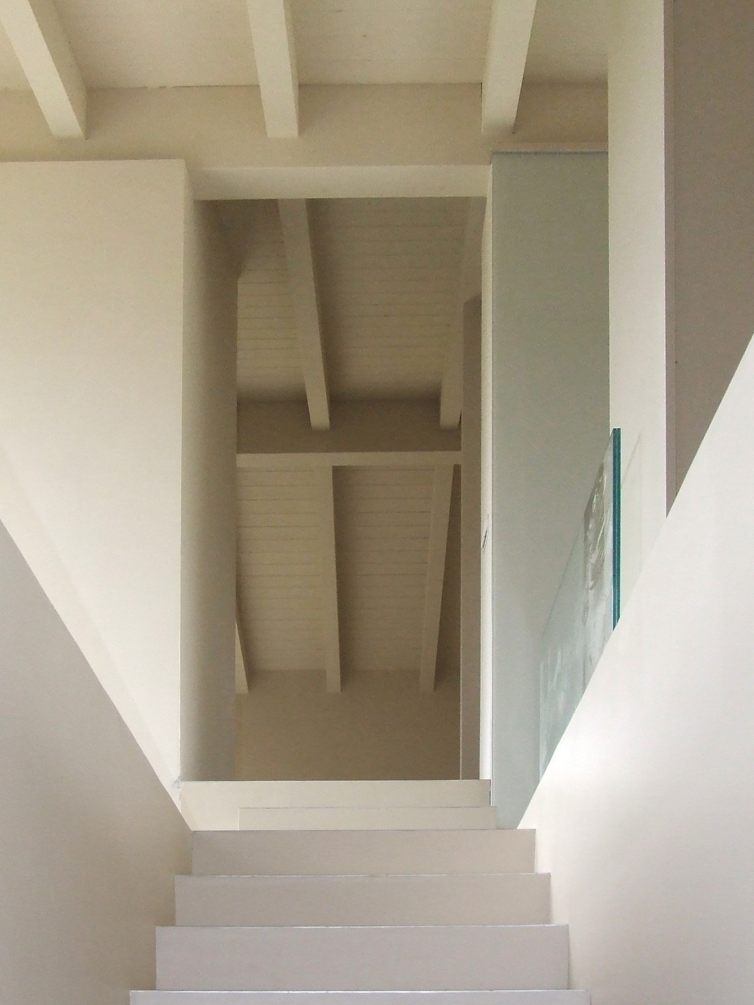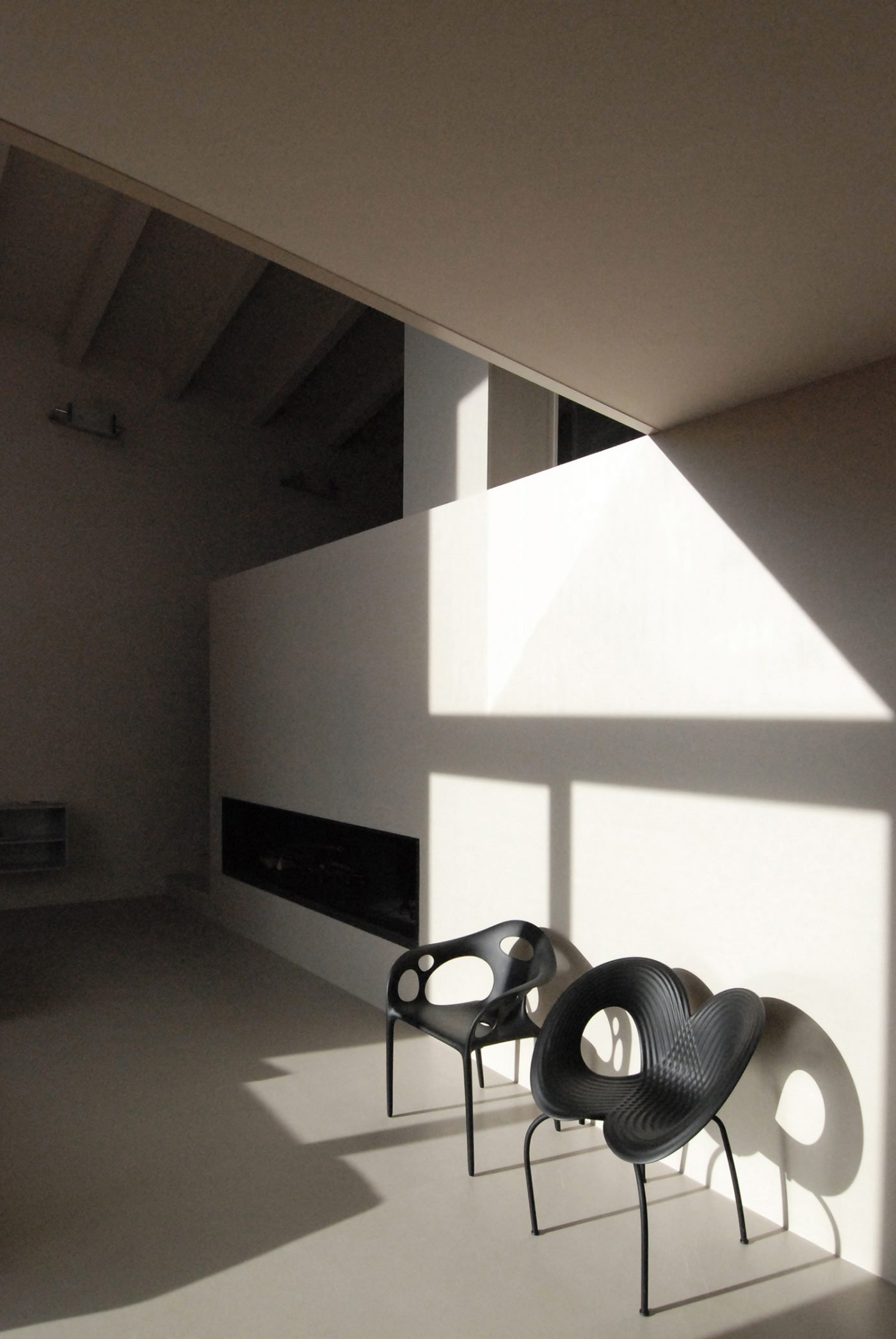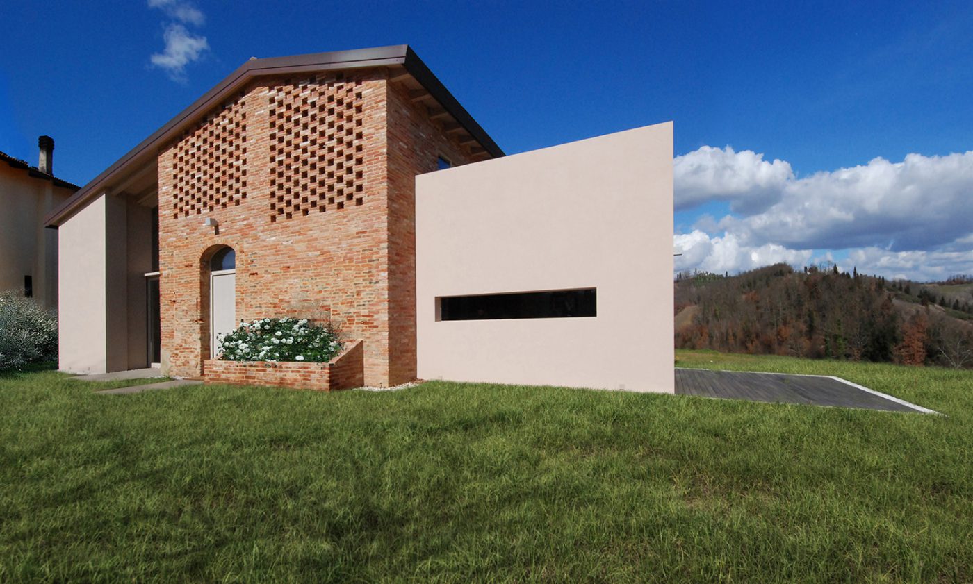 Nel preservare continuità con la precedente identità rurale dell’edificio vengono eliminate le canale di gronda, le pluviali, e le finestrature; quest’ultime vengono invece sostituite da aperture che inseriscono come pause tra le volumetrie o si nascondono dietro grandi diaframmi in laterizio. Alla base il rapporto con il prato adiacente appare molto diretto: i marciapiedi infatti sono stati sostituiti con una piccola fascia di ghiaia