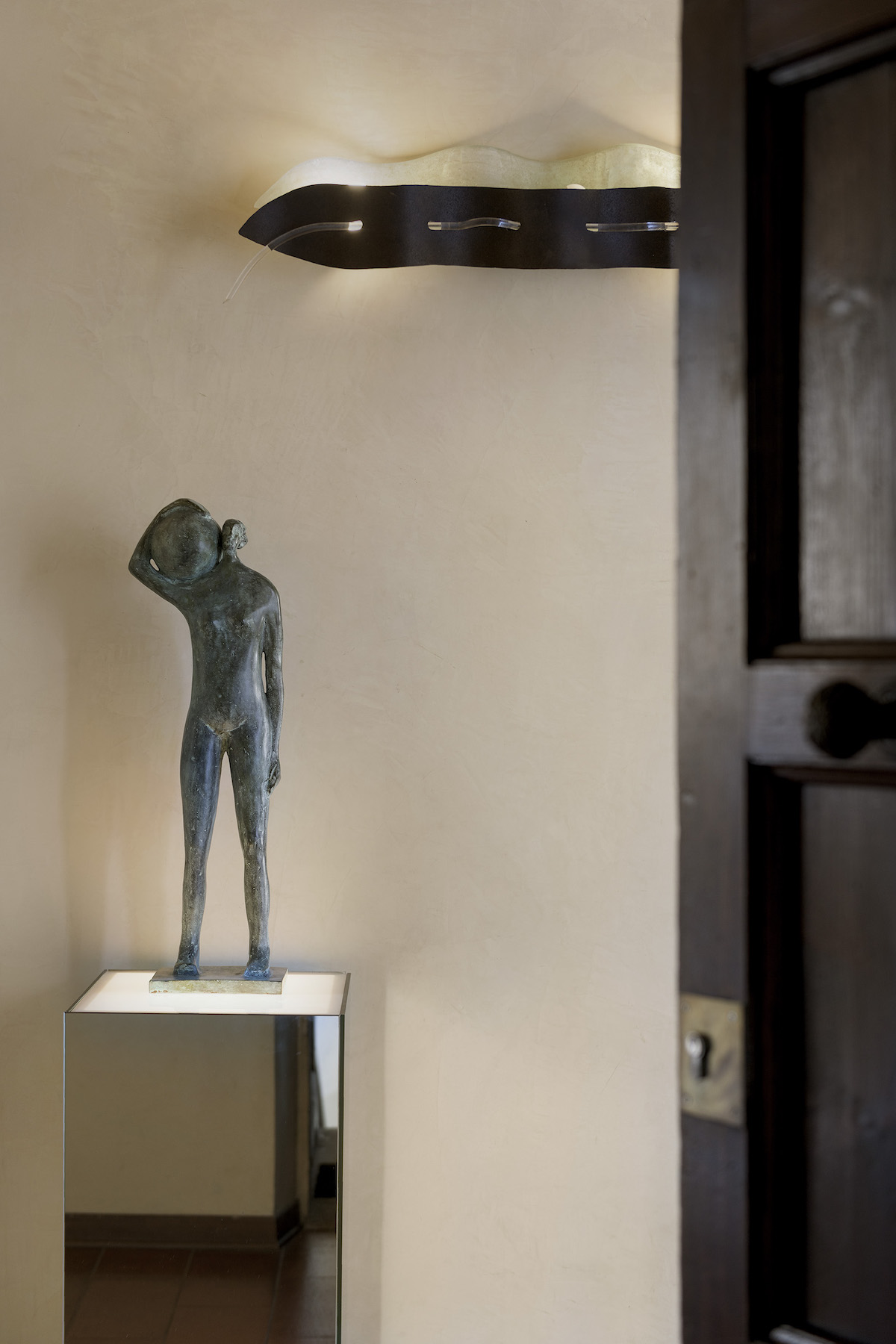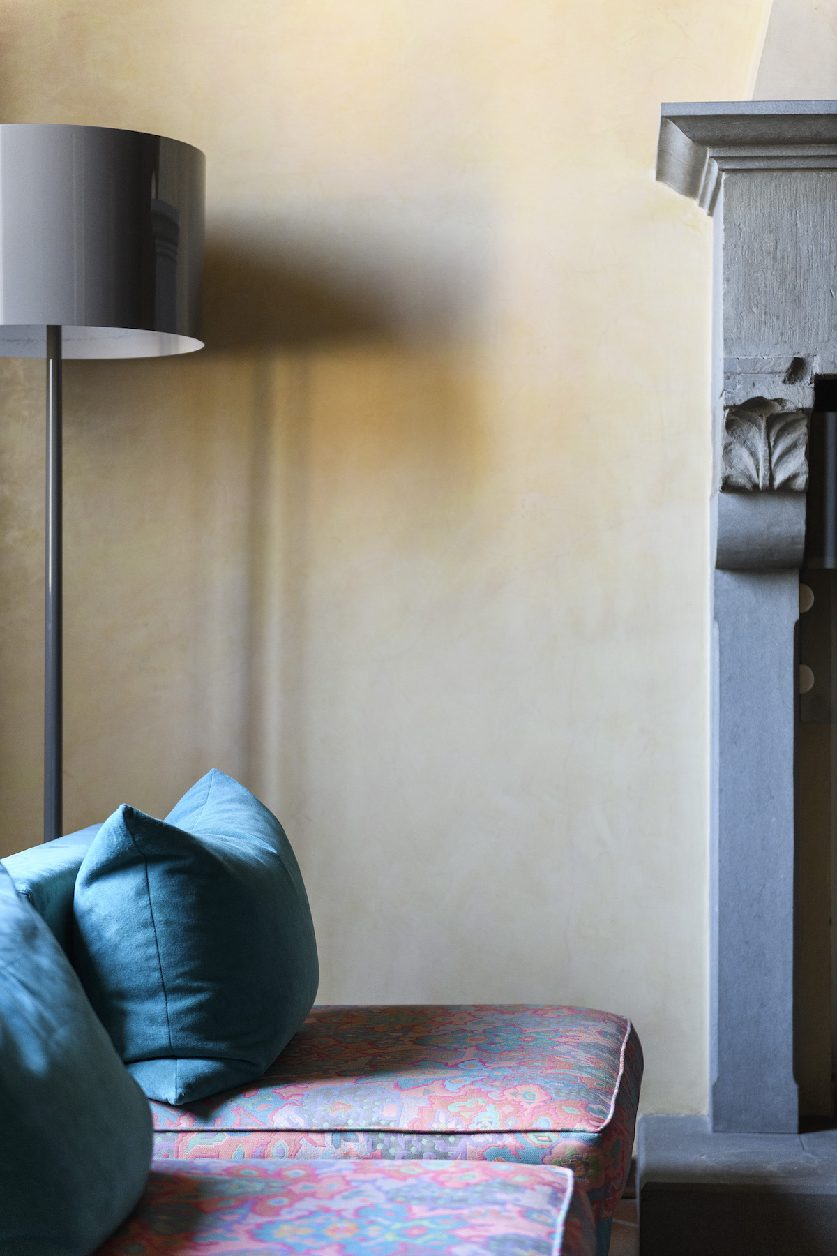 Gli elementi cinquecenteschi e le preesistenze, come travi in legno a vista, camini in pietra o archi nel corridoio, dialogano dialogano con soluzioni su misura, arredi di design iconici, opere d'arte, definendo spazi dalla personalità unica