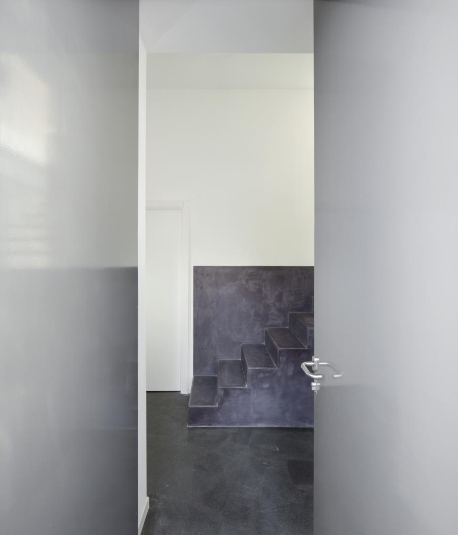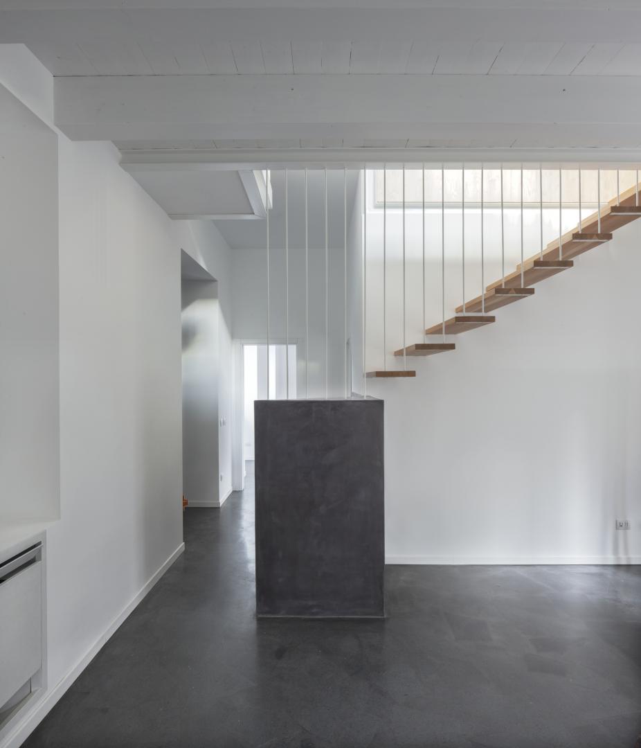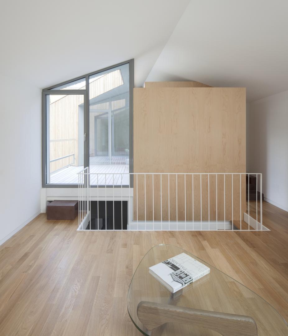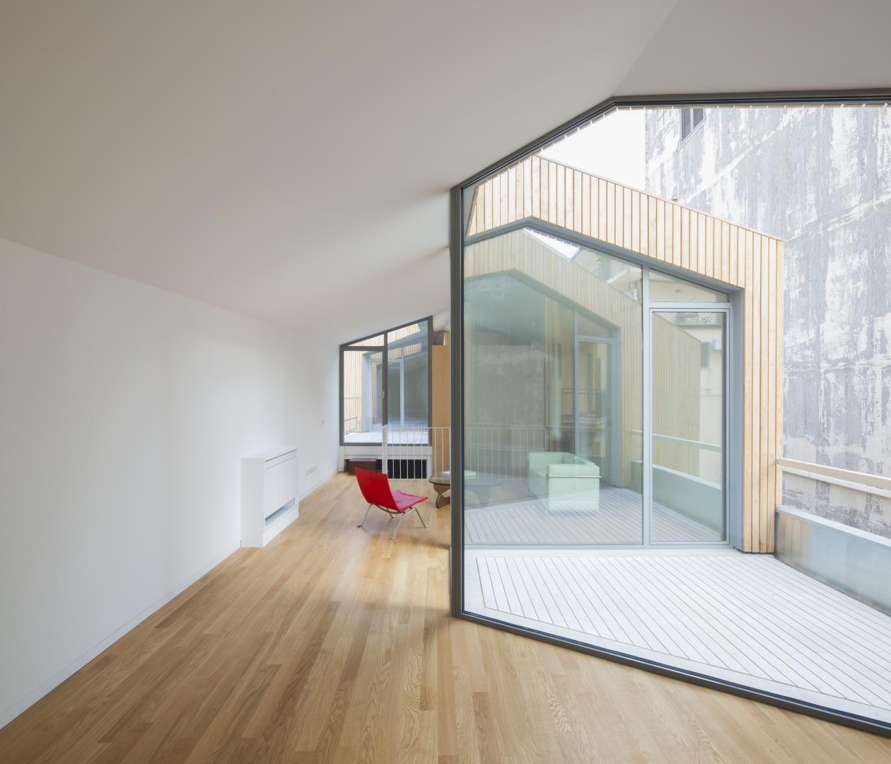 L'edificio di nuova realizzazione è un volume ligneo intagliato in profondità da due terrazzi sulla diagonale degli squarci: una gemma incastonata fra i retri eroici degli edifici alti