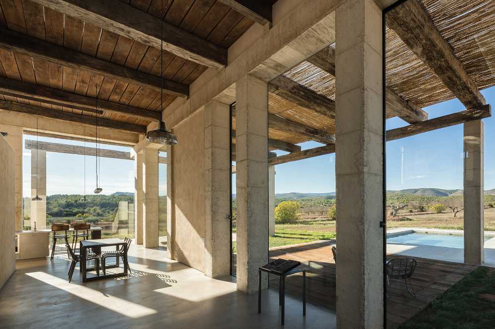 La Villa è infatti situata nell’entroterra di Castellón, in una zona prettamente montuosa, e la casa sorge su un’area piatta e uniforme, rendendo ancora più visibile il gioco verticale della trama esterna. I pilastri in cemento, le travi di legno provenienti dai piloni del porto di Rotterdam e gli elementi in ferro e vetro, mostrano la loro vera essenza senza mascherare il proprio carattere