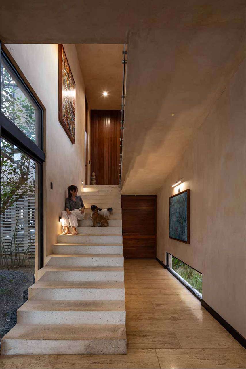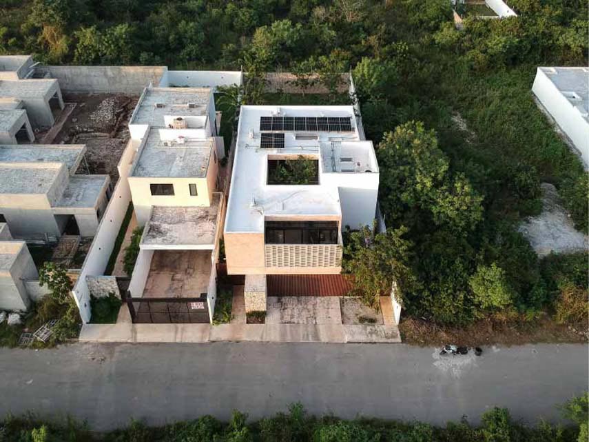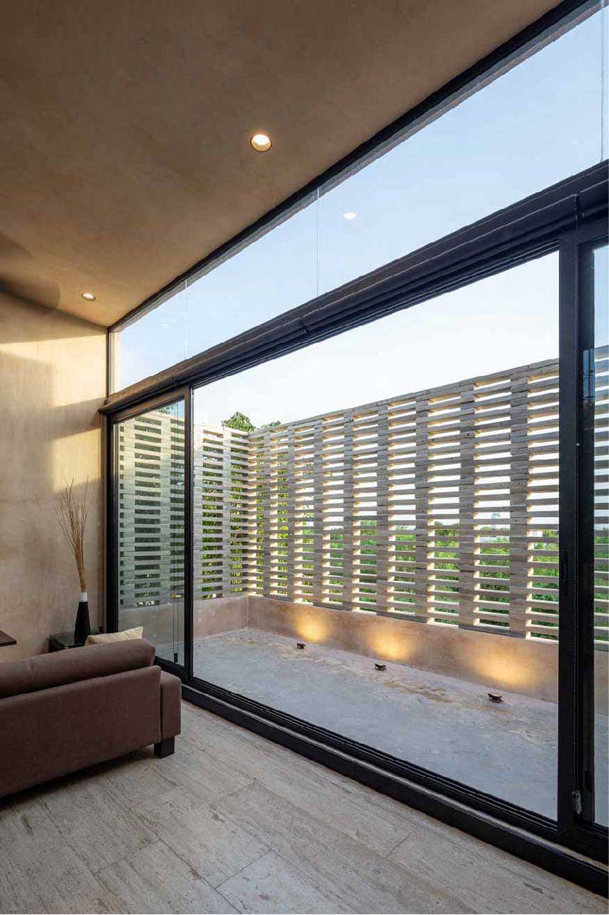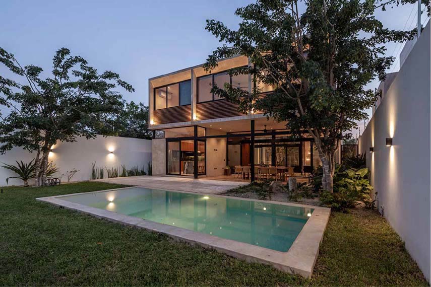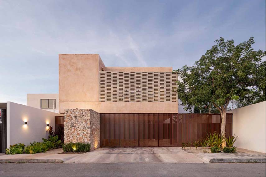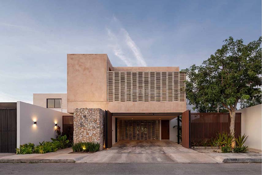 Casa Terral è uno dei progetti di architettura dello studio messicano P11 Arquitectos e, nella sua funzionalità combinata all’estetica e alla sostenibilità ambientale, incarna l’essenza dell’architettura contemporanea yucateca. La composizione geometrica degli esterni è scandita dall’incontro dei materiali: il gesto orizzontale in doghe di alluminio segna il piano più basso; intersecato al primo, un parallelepipedo in pietra proveniente dallo scavo di fondazione della villa stessa; al di sopra un volume massiccio trattato con intonaco tradizionale Chukum mischiato a Kankab, la terra rossa della penisola; infine il solido traforato tipo gelosia che caratterizza indelebilmente l’identità della villa