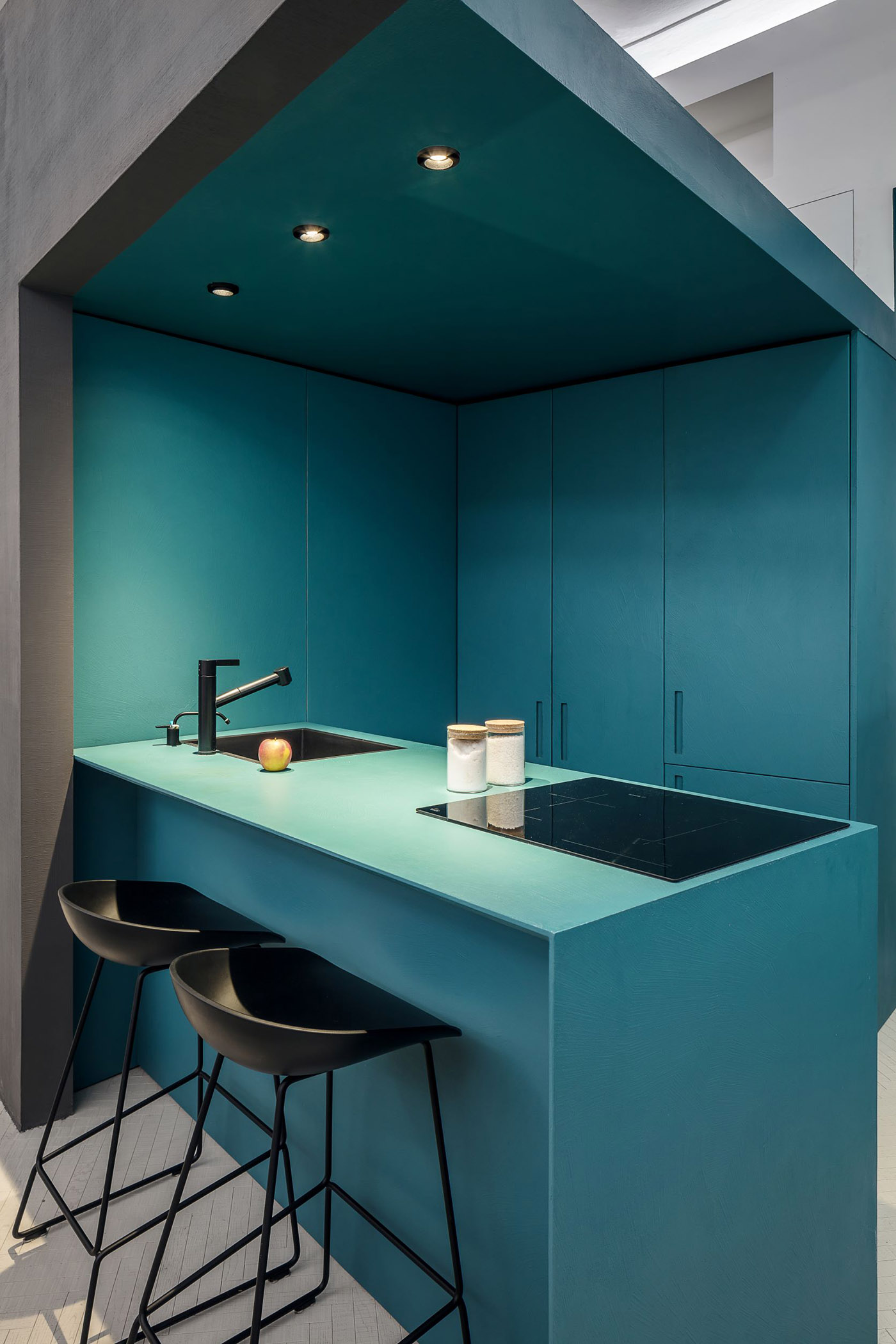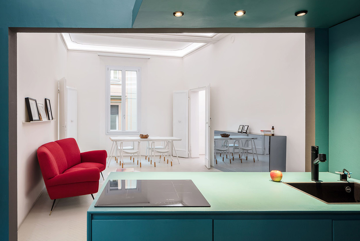 Le tre scatole che danno il nome a Casa tre prismi preservano gli ambienti dall’invasione di elementi d’arredo sostituendosi ad essi. Inoltre, i prismi dalla finitura esterna antracite in abbinamento ad interni dai colori vibranti, con le loro aperture geometriche, si inseriscono in modo divertente e inaspettato nella struttura originaria di cui sono stati conservati i soffitti modanati