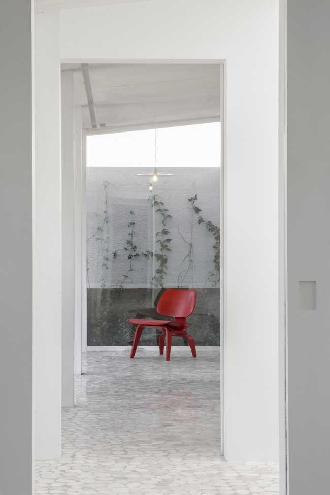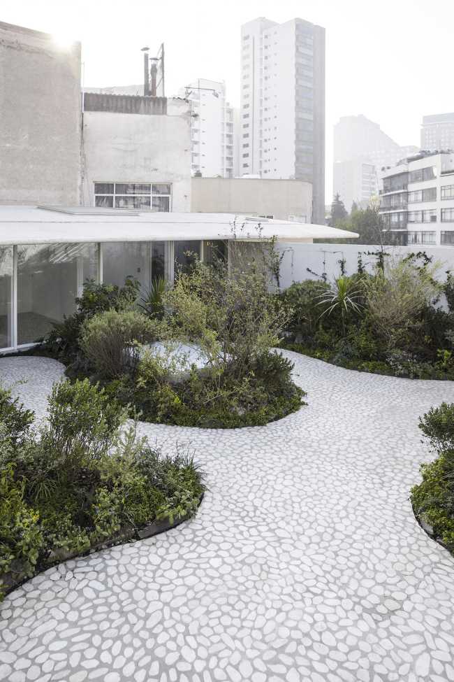 Tutte le parti nuove della costruzione sono realizzate in cemento di marmo bianco per ottenere un ambiente fresco e contemporaneo. Oltre al nuovo tetto l'intera pavimentazione è realizzata con ciottoli di marmo come citazione ai letti fluviali perduti di Città del Messico e ai laghi che componevano il paesaggio prima che la città fosse fondata