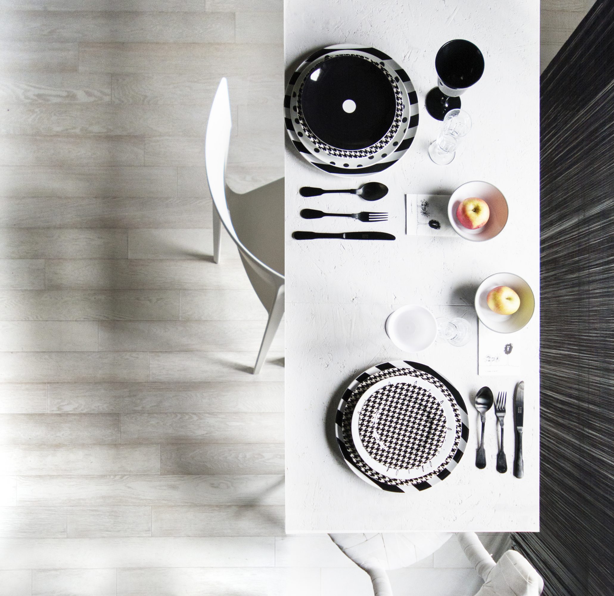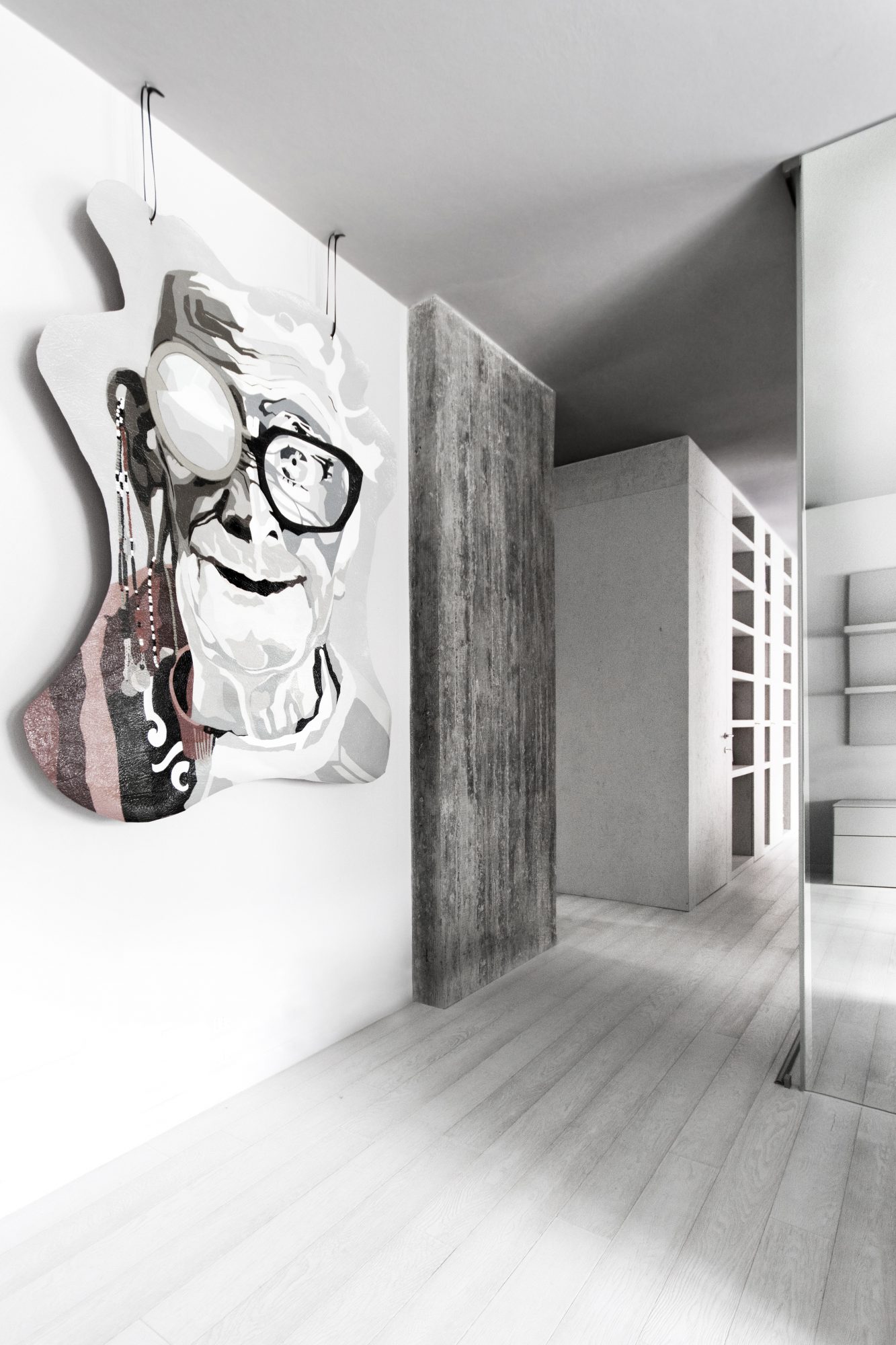 Lo sfondo monocromatico in "total grey" crea un effetto di totale unione e omogeneità all'interno dell'abitazione : l'effetto è quello di una tela neutra sulla quale ogni dettaglio di colore viene messo in luce ed enfatizzato