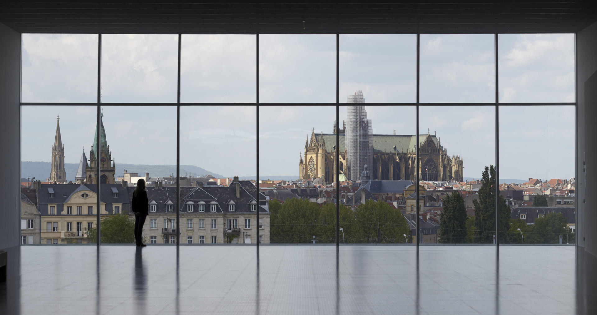Per stabilire la continuità contestuale con la città, le grandi vetrate alle estremità dei tre "tubi galleria" incorniciano viste dei monumenti della città. Attraverso questo progetto, l'edificio e la città si fondono. La vista dalla galleria superiore del tubo 3 incornicia il Duomo, simbolo di Metz