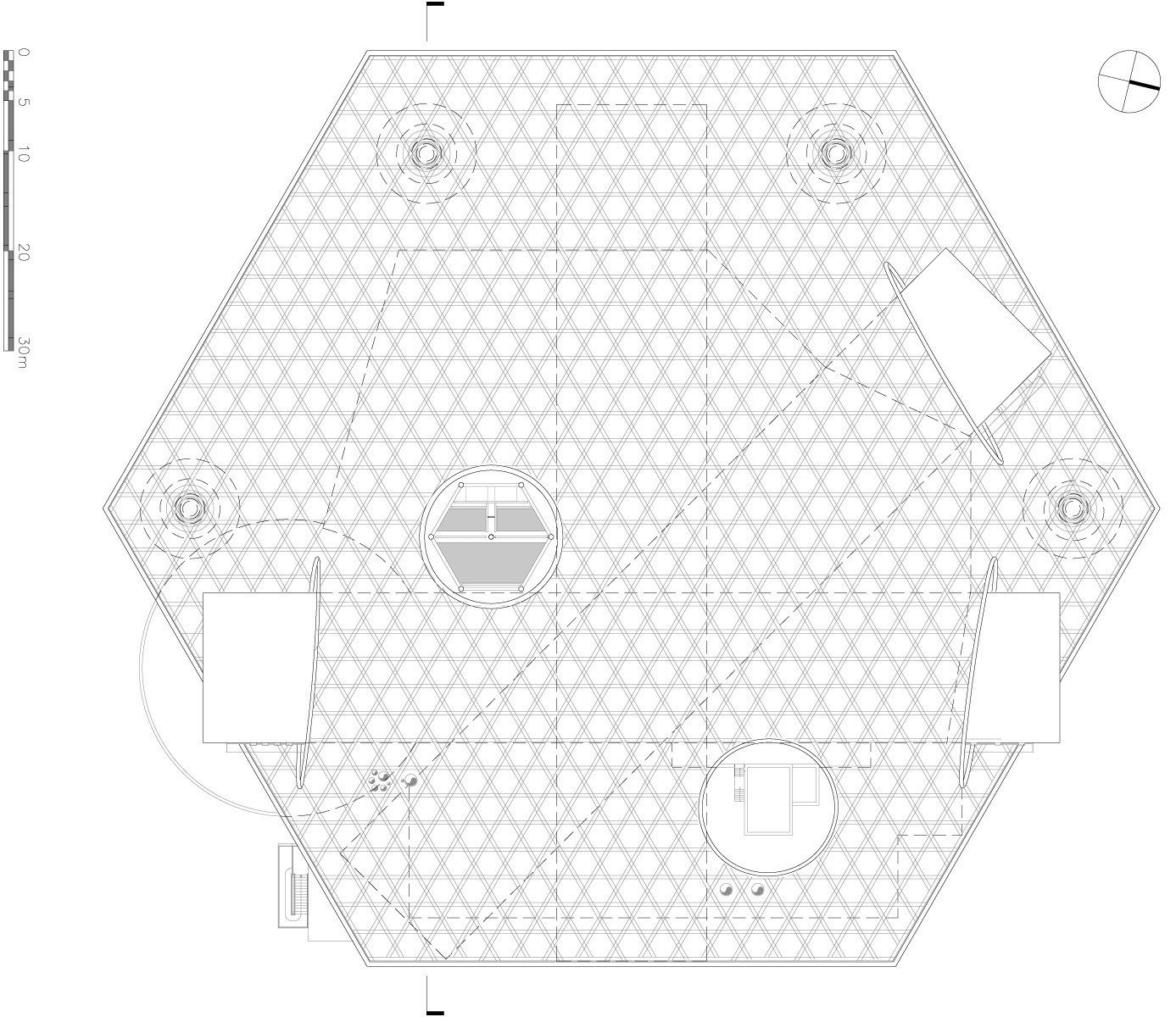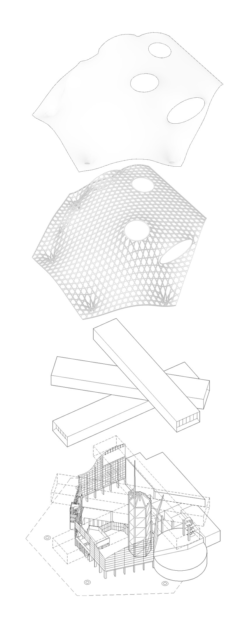 L’architetto ha realizzato una struttura a griglia con legno lamellare, che può essere facilmente piegata nelle due direzioni. Nasce così l’idea di una struttura a guscio, compressa, ma anche una struttura a maglia che lavora in trazione