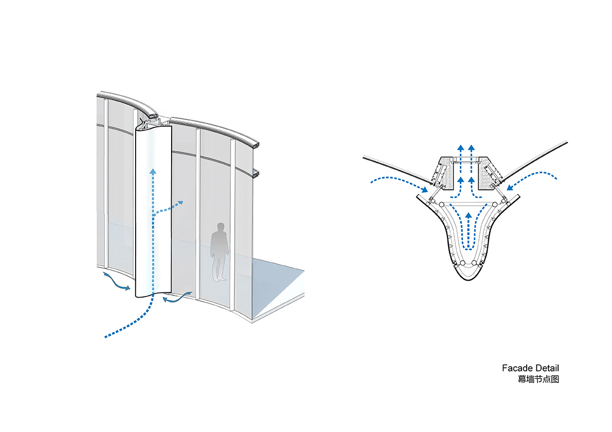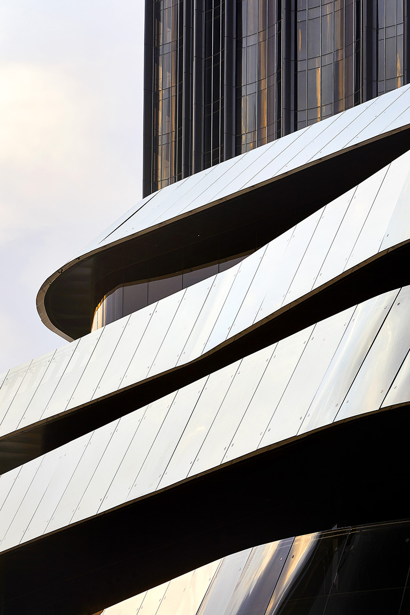 Le alette verticali visibili sulla facciata esterna in vetro enfatizzano la levigatezza e la verticalità delle torri. Funzionano anche come sistemi di ventilazione e filtrazione efficienti dal punto di vista energetico, aspirando aria fresca al chiuso. Alla base delle torri c'è un laghetto che, pur facendoli apparire come se andassero all'infinito, funziona come un sistema di raffreddamento ad aria in estate, diminuendo la temperatura complessiva dell'interno