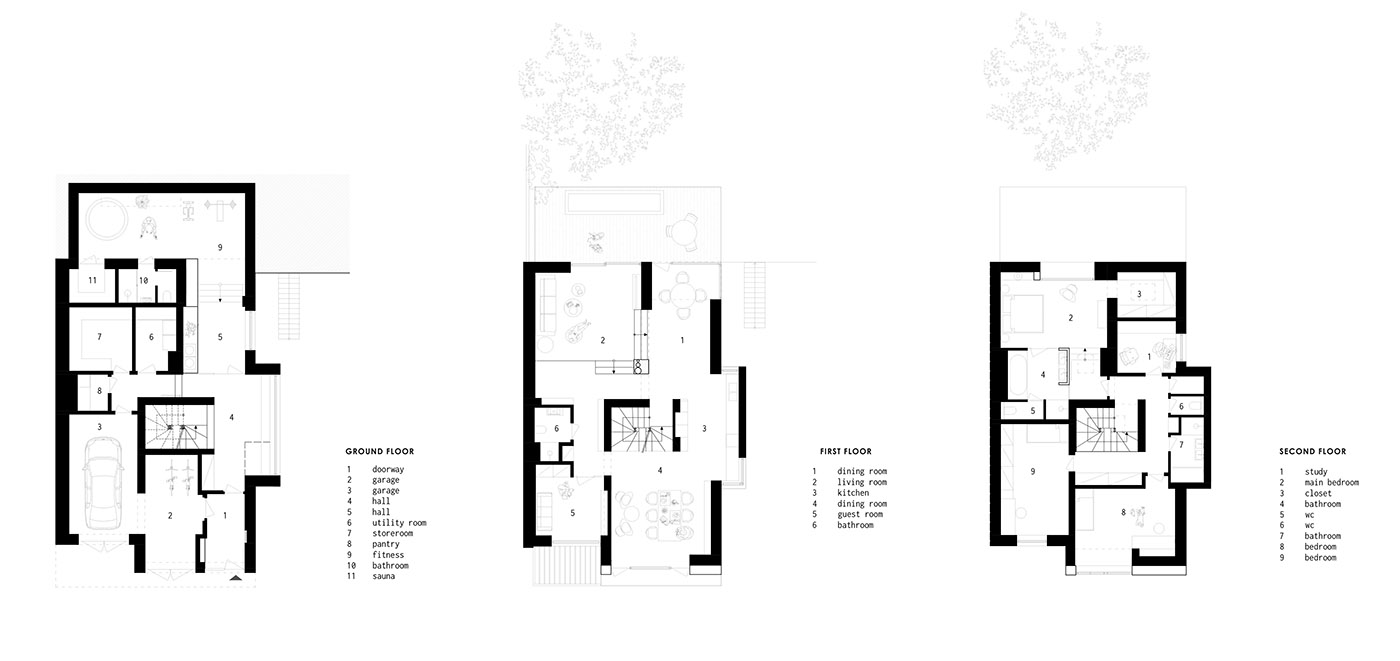 Il progetto di riqualificazione dello studio di architettura SOA architekti, per rispondere alla nuova esigenza di un’unica abitazione per la famiglia dei committenti, ha previsto innanzitutto l’unificazione della casa con il collegamento diretto di tutti i piani: la scala diventa il nuovo centro del layout della Cherry Tree House. Il piano terra rimane un ambiente di servizio ma viene ridistribuito in maniera più funzionale e ampliato al di sotto del giardino per creare una palestra. Viene aperta una grande finestra nel vano scala