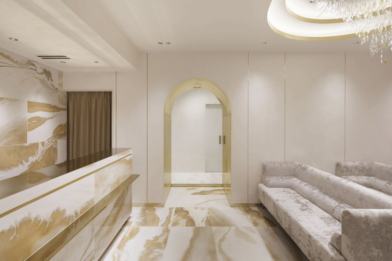 Luce, come compendio di bellezza e vitalità, è il nome che è stato molto opportunamente scelto per rappresentare l’istituto. La nicchia ed il banco della reception, affiancati da una porta ed un passaggio ad arco, che seducono con la loro misteriosa e affascinante presenza in un’intrigante finitura aurea, creano un angolo speciale arricchito dalla sontuosità delle venature ed ombreggiature delle lastre ceramiche Cosmic Marble Lune, che, ispirata a mondi lontani, intende evocare le striature e gli aloni creati dalla polvere galassica ed il pallore della superficie lunare.