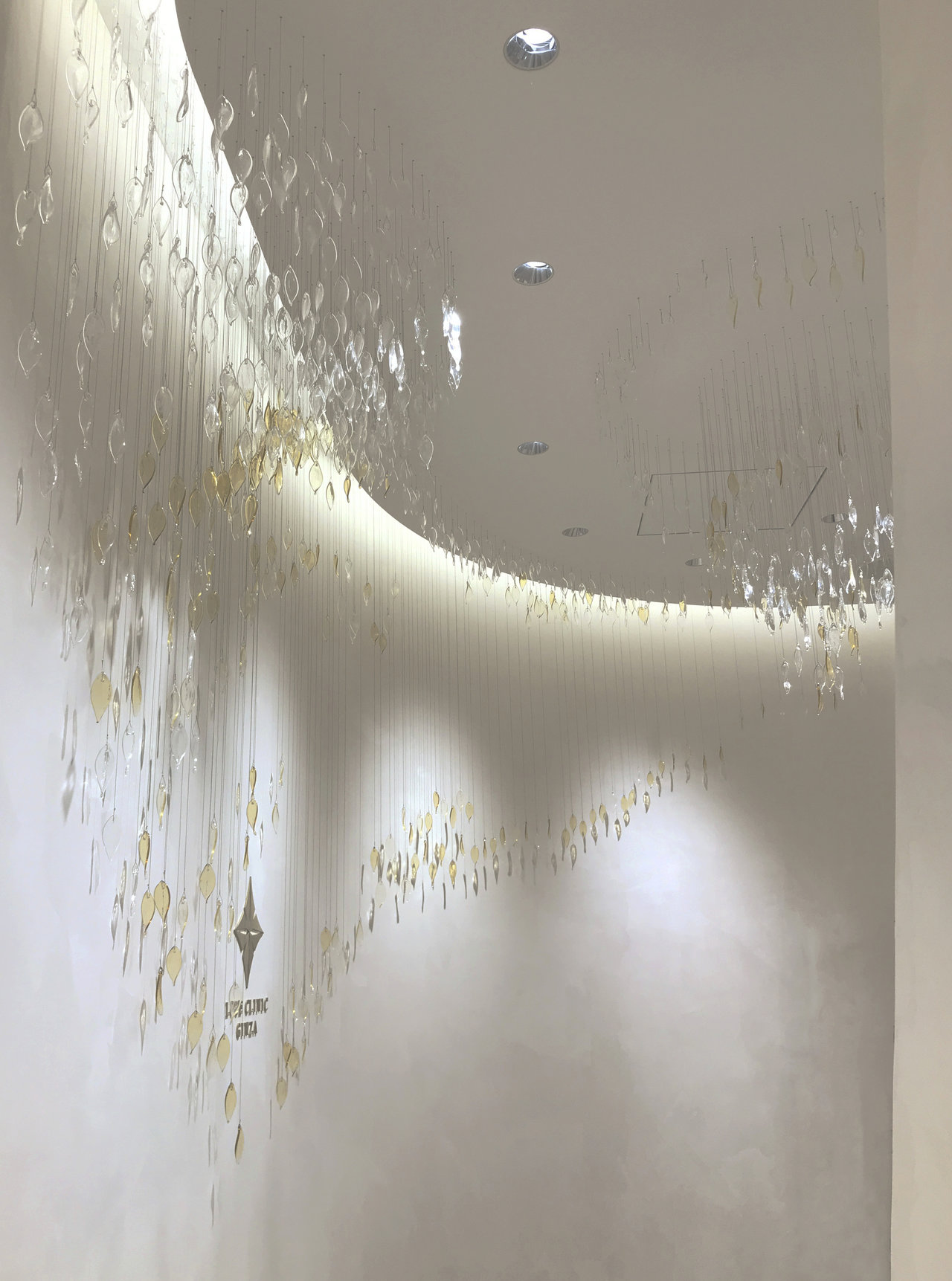 Il lampadario, composto da una cascata di minuscoli petali di vetro arrangiati attorno a fili impercettibili copiosi e ad altezze differenti, per effetto della translucenza dei vetri in una sfumatura aurea brunita sprigiona scintille di accesa, dorata luminosità, preludio ad una radiosità che si ritroverà alla fine del percorso dei trattamenti.