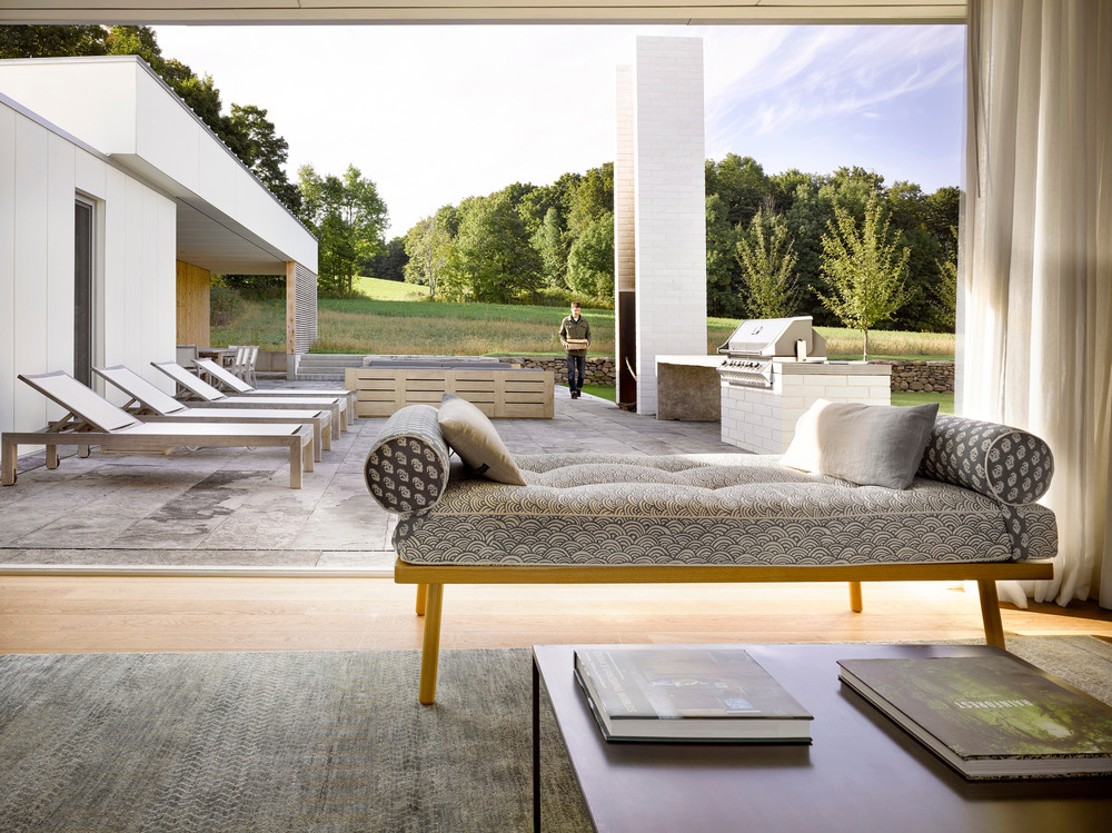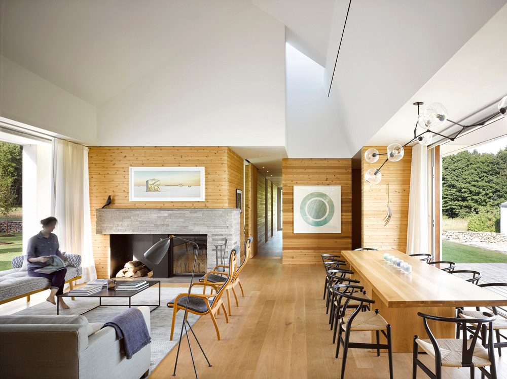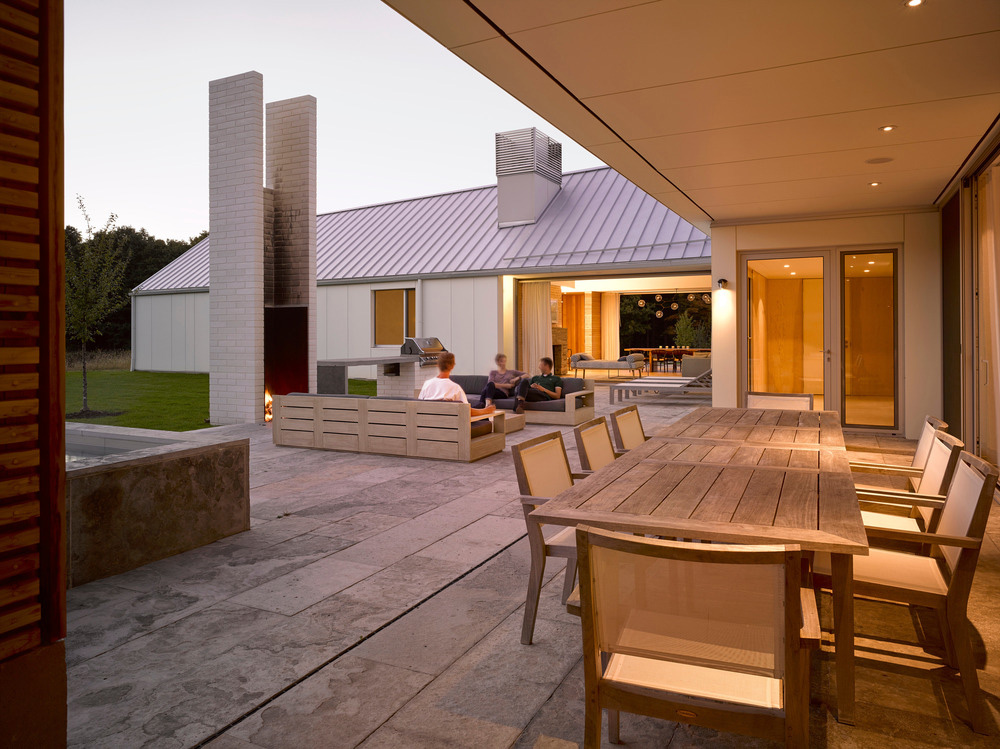 Le manipolazioni del paesaggio aiutano a incorporare e connettere la casa al suo sito: costruite con una pietra sul campo, i bassi muri di contenimento creano un basamento fondamentale per la casa e una dinamica di sezione migliorata. Due ali perpendicolari racchiudono un cortile esterno intimamente scalato. In risposta alla bassa orizzontalità dell'edificio, la forma totemica del caminetto esterno aggiunge un contrappunto verticale critico, così come i lucernari posizionati in modo giudizioso negli aerei a tetto spiovente della casa, che consentono morbidi lavaggi di luce per illuminare l'interno