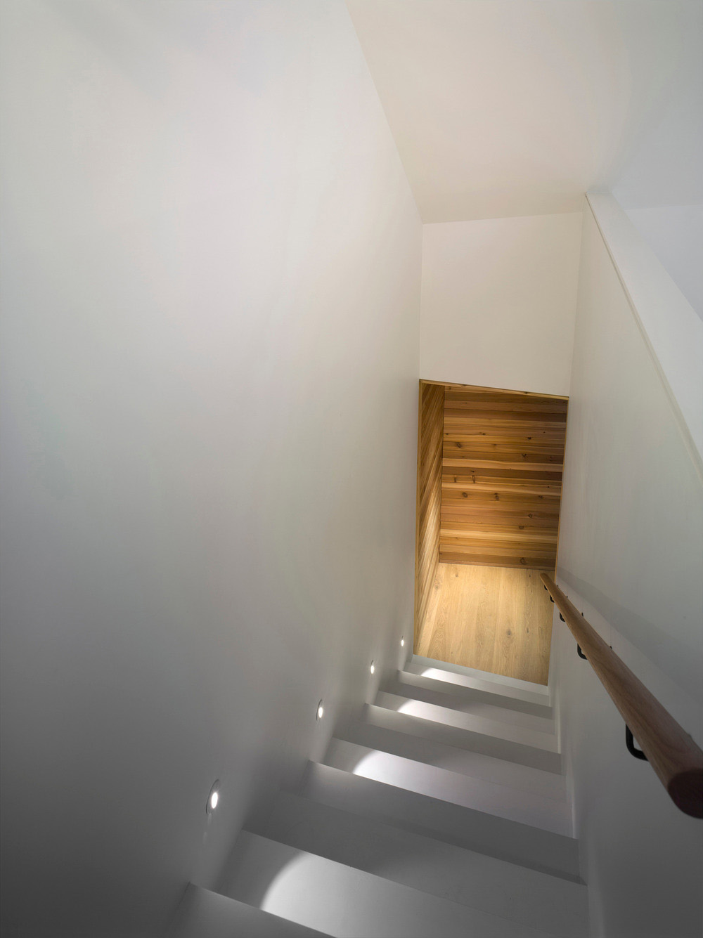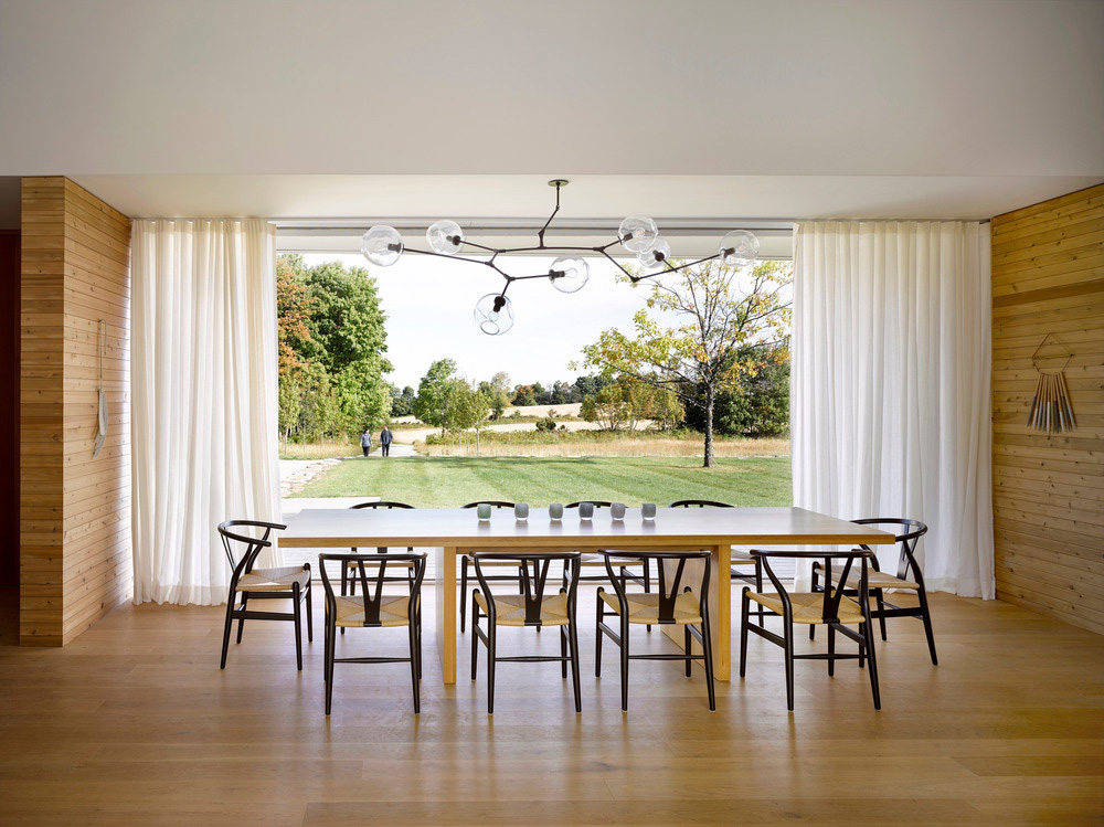 All'interno, pavimenti e pareti in quercia bianca e cedro bianco nodoso sono delle texture e caldi. Al contrario, il soffitto sopra lo spazio principale è bianco, espansivo e apparentemente senza limiti. La netta differenza nella materialità riecheggia l'incontro tra terra e cielo fuori. All'esterno, l'impegno dell'azienda verso un'architettura duratura si manifesta nell'uso di materiali da costruzione a bassa manutenzione come rivestimenti in pannelli di cemento, finestre in alluminio e un tetto in acciaio. Costruito per invecchiare con grazia, la casa sosterrà per generazioni