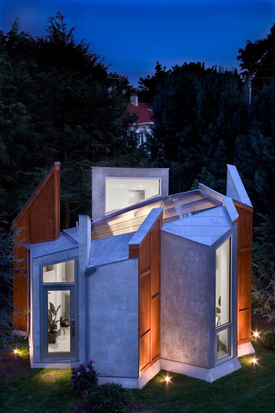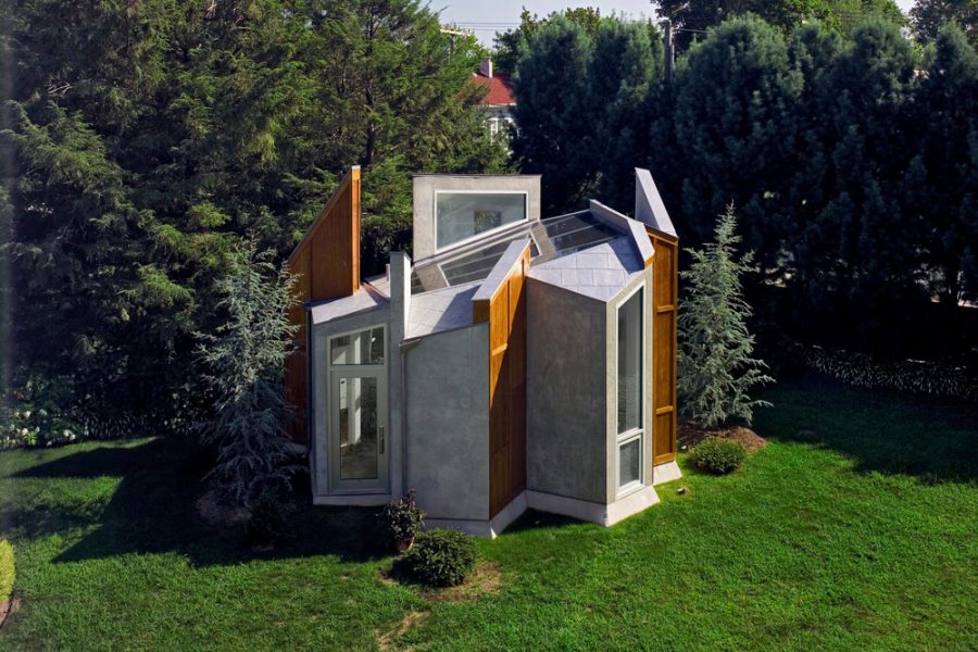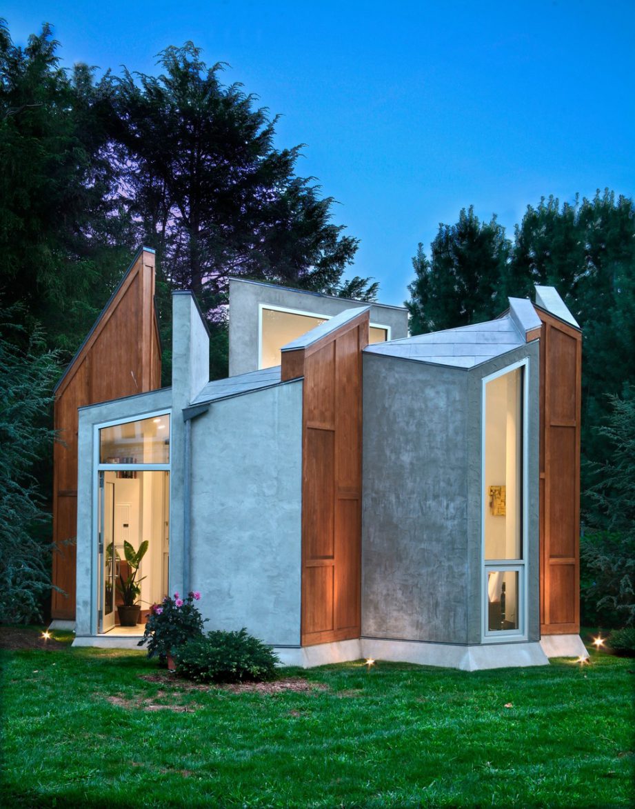 Ispirato in parte dalla chiusura delle ali di una farfalla e di altre forme organiche, questo studio d'arte di 350 piedi quadrati e un ufficio privato per una casa di famiglia a Westport, nel Connecticut, offre un rifugio sereno. Come schegge sporgenti dalla terra, i pannelli angolari dello studio rivestiti in stucco e teak riciclato, conferiscono una qualità primitiva e futuristica allo stesso tempo. La struttura sfrutta le potenzialità del vetro, del legno e dell'acciaio