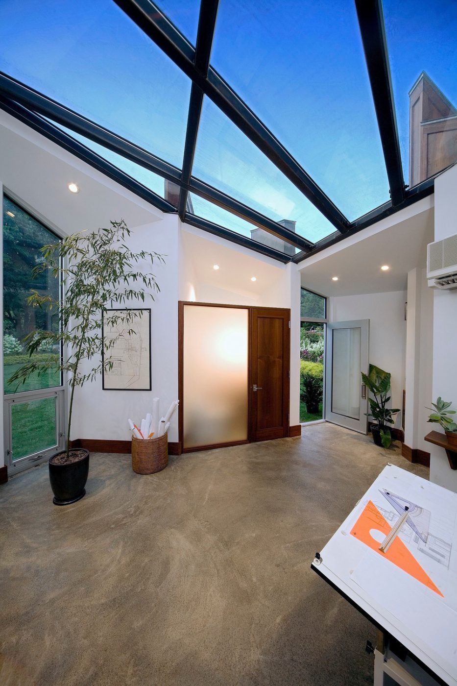 L'ampio lucernario in acciaio e vetro termicamente isolato elimina la necessità di illuminazione diurna, anche per un artista. Crea anche un ariosità nonostante la piastra del pavimento confinata. L'efficienza è favorita dal pavimento in calcestruzzo colato sigillato che contiene tubazioni termiche radianti; si può spostare una scrivania su ruote in tutto lo spazio