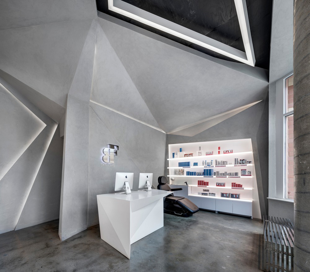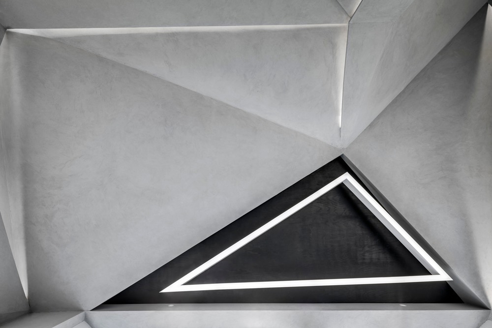 Lo spazio di vendita è un alto recinto sfaccettato di pannelli triangolari rivestiti in calcestruzzo spazzolato, visibile ai passanti attraverso finestre di archivio. In alto, una lampada a led triangolare personalizzata incornicia il bordo della superficie rivestita in cui si ferma per esporre il soffitto. La reception è stata progettata e realizzata su misura in un modello sfaccettato per completare le pareti