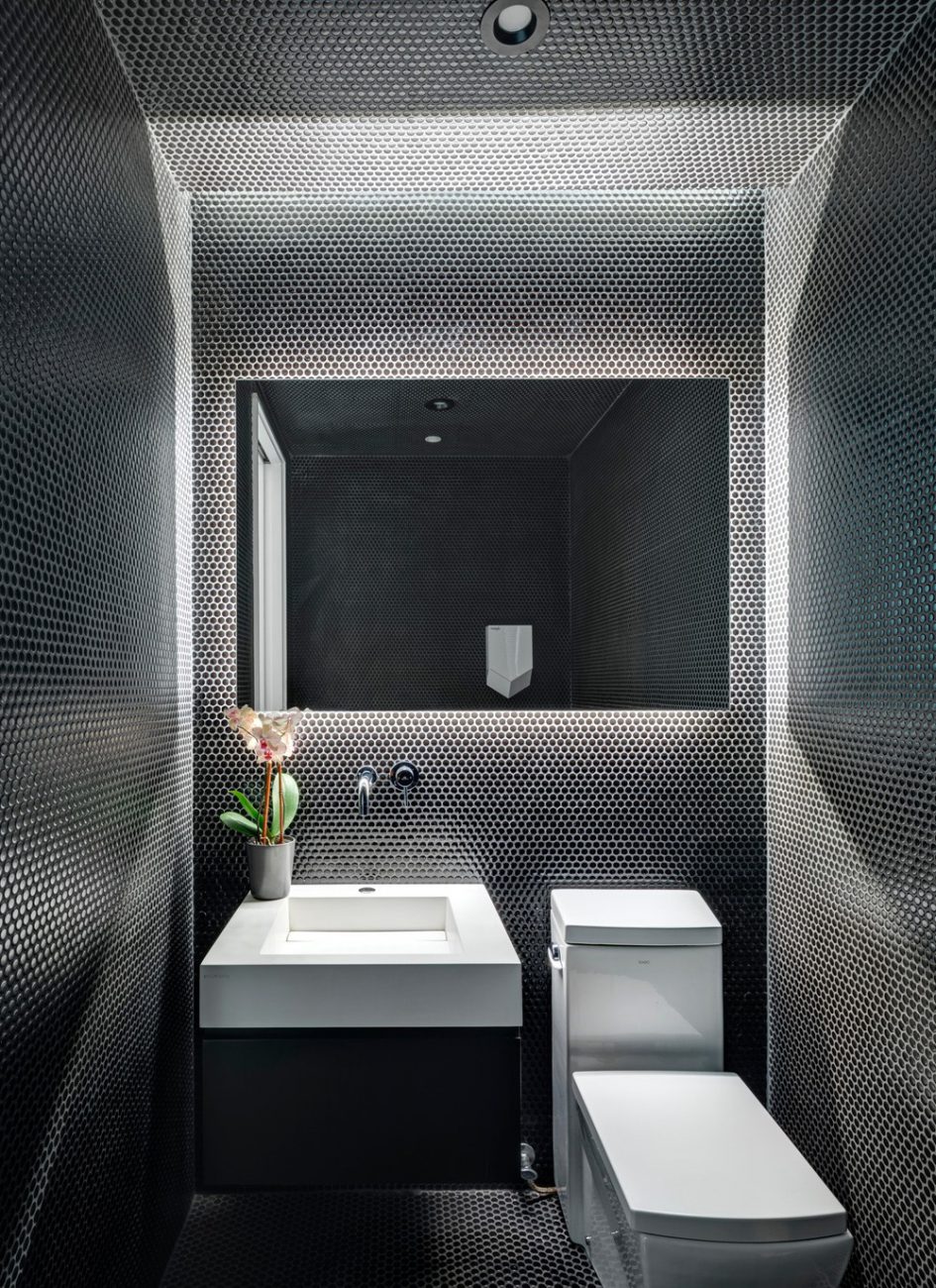 Il bagno al termine della sala è completamente rivestito in piastrelle di penny nero con uno specchio retroilluminato che fornisce illuminazione. Una sala di trattamento dispone di una doccia rivestita in piastrelle bianche e grigie. L'accesso a un soppalco attraverso un ufficio offre un ulteriore spazio di stoccaggio e spazio per i tecnici