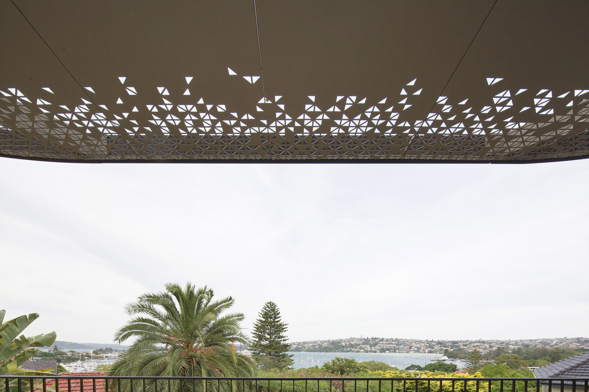 La tenda da sole, con motivo triangolare, è stata studiata appositamente per questo caso, attraverso processi di progettazione algoritmica per bilanciare la connessione con il cielo e ombreggiatura solare