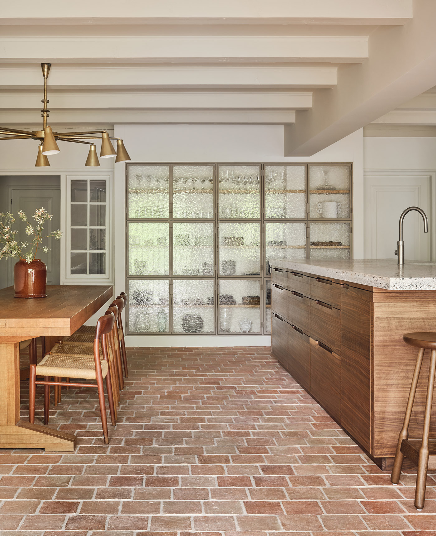 In una stanza con così tanta luce naturale, un mobiletto monolitico in noce la cui forma rispecchia le finestre di fronte ad esso attira l'attenzione del fruitore. Un grande divano verde e un cocktail bar integrato con un piano in terrazzo fanno di questa una stanza dove puoi rilassati dal tramonto all'alba