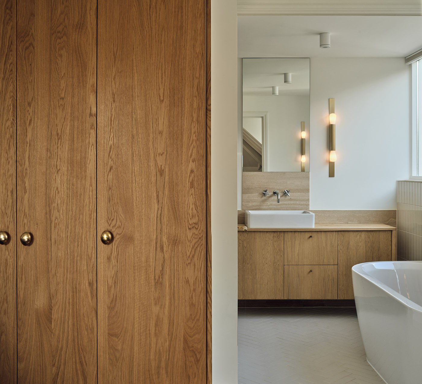 Il top della cucina, in terrazzo, è abbinato ai dettagliati armadi in legno che poggiano su un pavimento piastrellato in terracotta e un mobiletto in porcellana leggera fatto su misura. Al piano superiore dalla cucina il disimpegno d'ingresso è allo stesso livello della diga