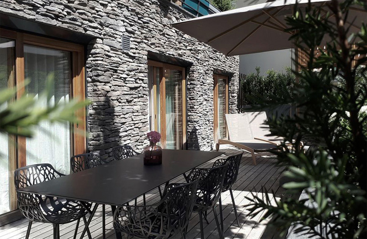 Il basamento in pietra è stato realizzato in collaborazione con Geopietra utilizzando il modello Blumone, dalla forma frastagliata e allungata tipica del luogo. Il Murogeopietra protegge lo strato di isolante evitando shock termici dovuti a repentini sbalzi di temperatura, è inoltre collaudato al gelo e testato ai climi più diversi per assicurare il massimo confort abitativo all’interno della casa