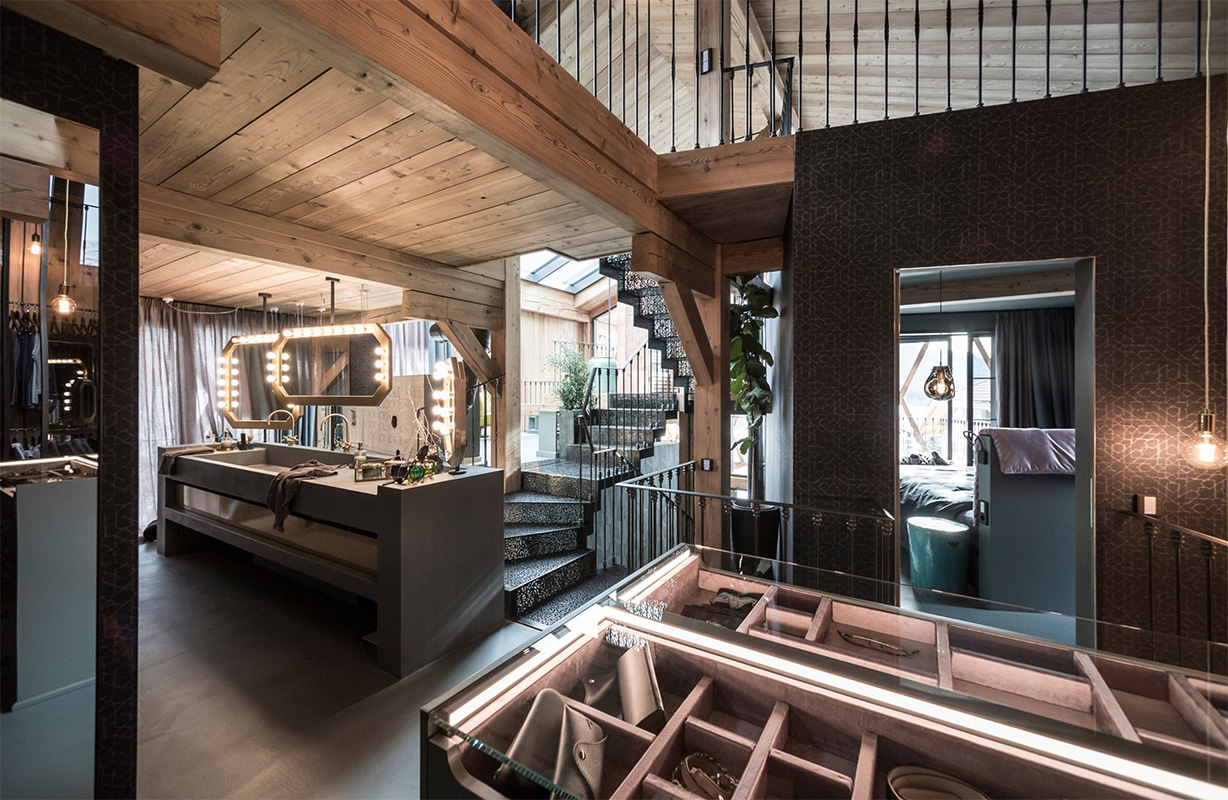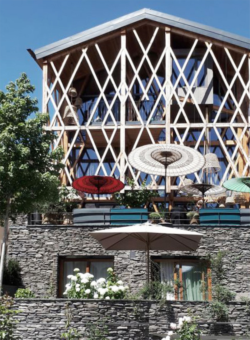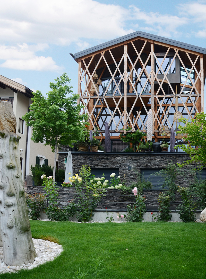 L’architettura al quale si ispirano gli architetti è quella tipica dei masi di montagna, caratterizzati dalla compresenza di una base in pietra e una struttura in legno, in questo caso però la struttura in legno stravolge le regole ergendosi in un gioco di incroci per tre piani racchiudendo finestre e balconi