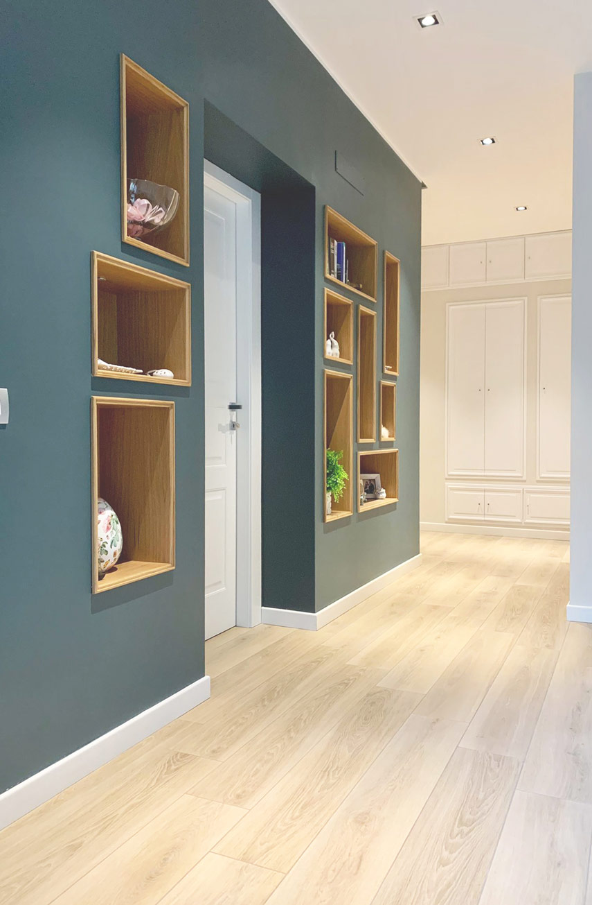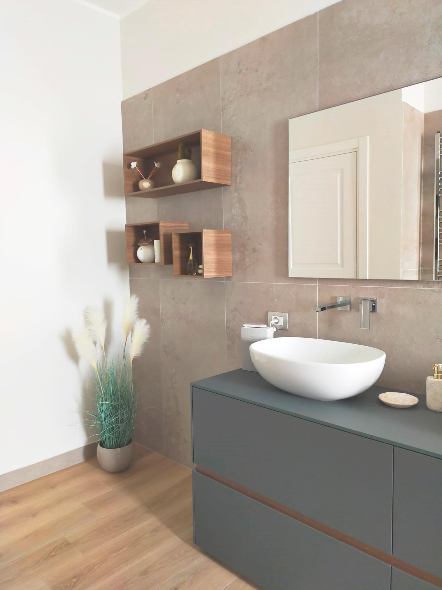 La palette cromatica gioca un ruolo fondamentale nell’identità del progetto: le tonalità calde del tortora, accostate al carattere deciso del blu petrolio, creano un equilibrio visivo raffinato e avvolgente. Il legno, utilizzato con coerenza in diversi punti della casa, armonizza gli spazi donando calore e una piacevole matericità che mette in risalto la nuova conformazione interna.