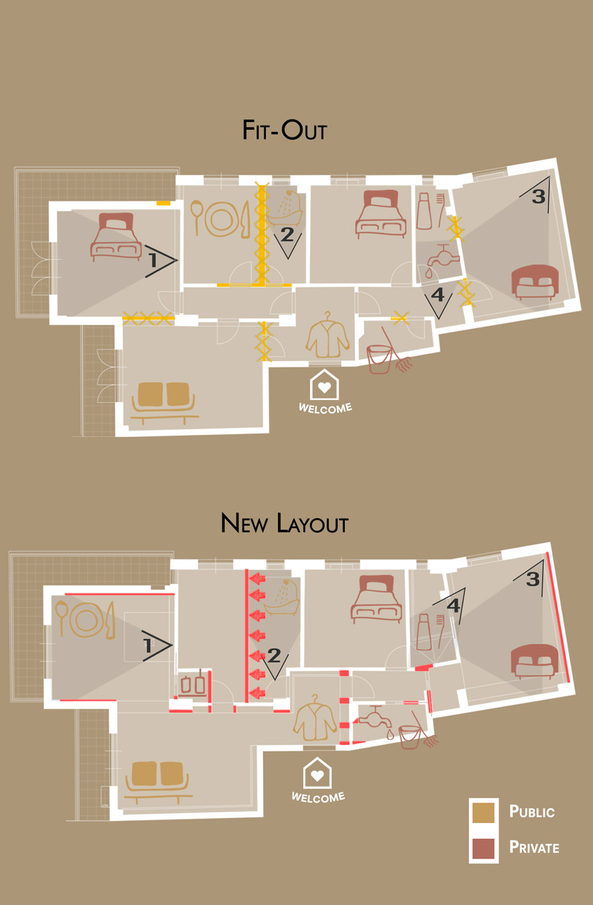 Piccoli accorgimenti, pensati da Mr. C Architetto, valorizzano la disposizione preesistente e migliorano sia comfort sia privacy.