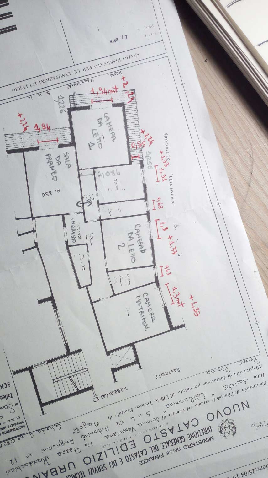 La configurazione originaria dell’appartamento rispecchiava le abitudini del periodo: un lungo corridoio separava cucina e soggiorno, mentre l’ingresso delimitato da porte e divisori limitava la diffusione della luce naturale. La zona notte non seguiva una logica precisa di privacy e comfort.