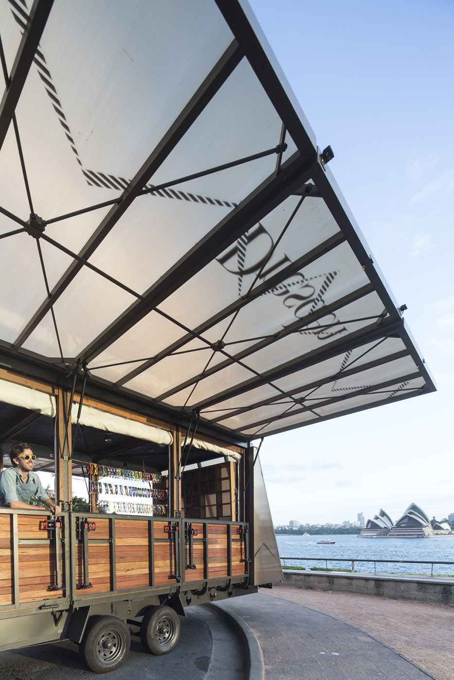 Progettato da Alexander Symes Architect e costruito con materiali prevalentemente riciclati, l'open-space interno facilita l'esperienza di vendita al dettaglio con le tende da sole che permettono al negozio di rispondere al clima, alle condizioni del luogo in cui si trova e alle viste dei paesaggi circostanti