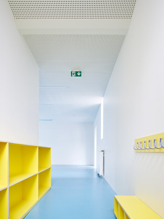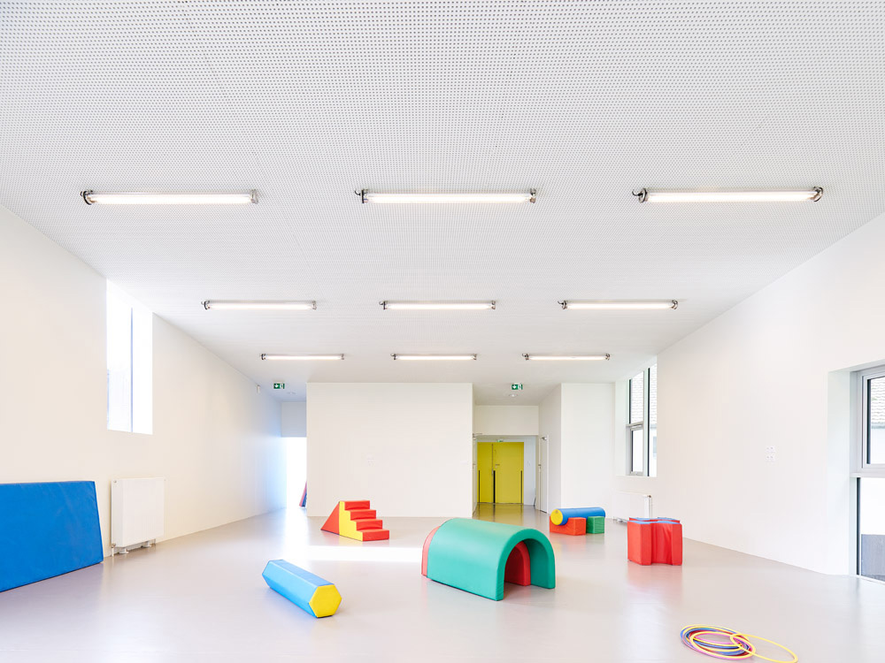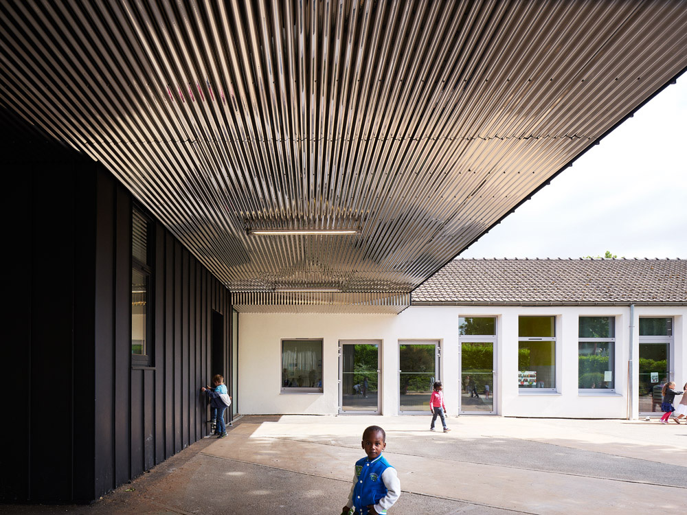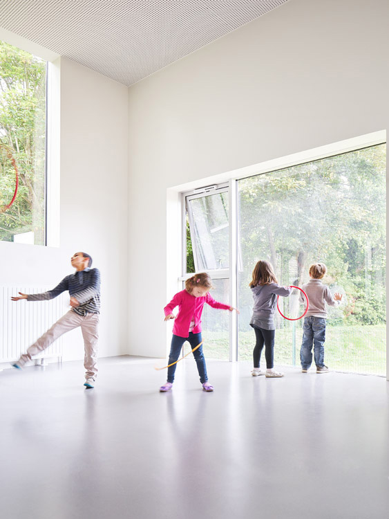 L’edificio conserva le qualità esistenti e si apre a delle nuove, con un maggiore dialogo con l’esterno. Al fine di conservare la corte di ricreazione a sud e garantire al tempo stesso un’illuminazione naturale degli spazi interni per tutta la giornata, due delle tre estensioni, si impiantano verso nord